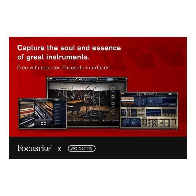 Free Addictive Keys - The Addictive Keys virtual instrument from XLN Audio is now included for free with all Focusrite audio interfaces. One full license per account enables you to choose one world-class Addictive Keys instrument, such as Modern Upright, Studio Grand, Electric Grand or Mark One.
