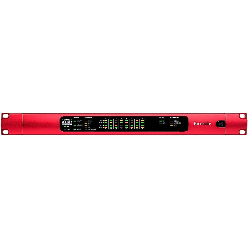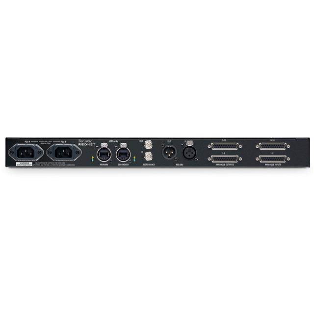 RedNet A16R is a 1U bi-directional Network Audio Interface providing 16 analogue inputs and 16 analogue outputs, plus an additional two channels of AES/EBU I/O - the XLR input socket for which may alternatively be used for DARS. Word Clock in and out are also provided on BNC connectors. Internally, analogue signals are converted using precision Focusrite conversion technology to and from 24-bit digital signals. User-selectable sample rates of 44.1kHz, 48kHz, 88.2kHz, 96kHz, 176.4kHz and 192kHz are supported for both A-D and D-A conversion and Jet PLL technology is employed to minimize conversion jitter. All analogue inputs and outputs offer a frequency response of 20Hz-20kHz +/-0.05dB, with a dynamic range of 119dB A-weighted.