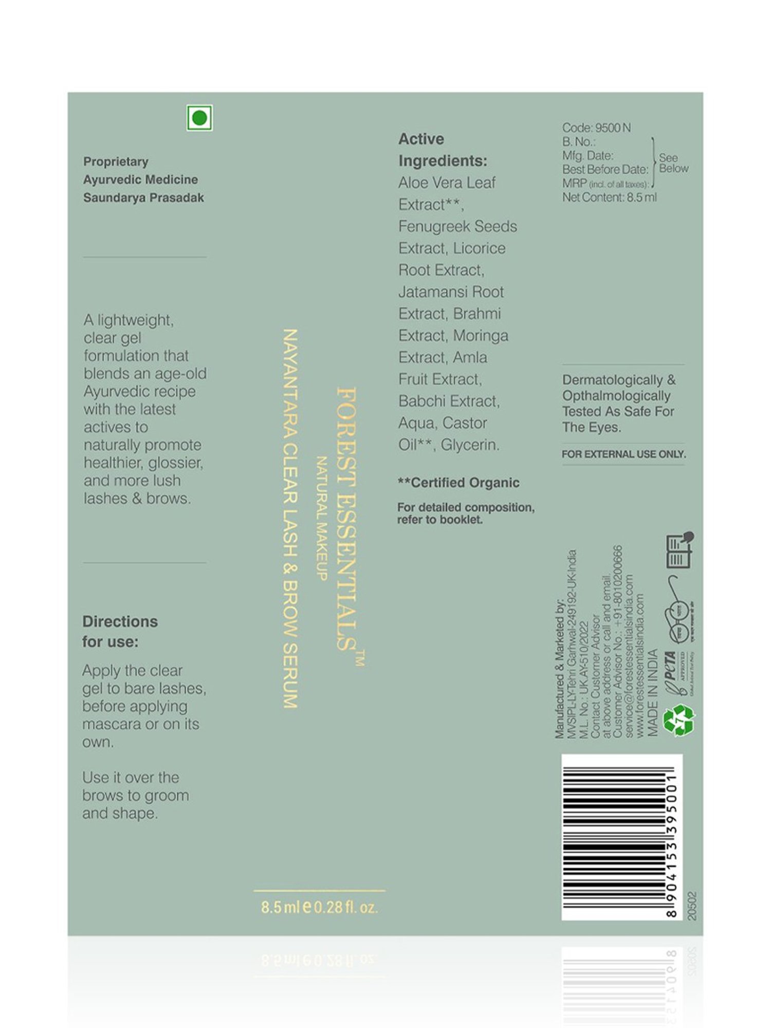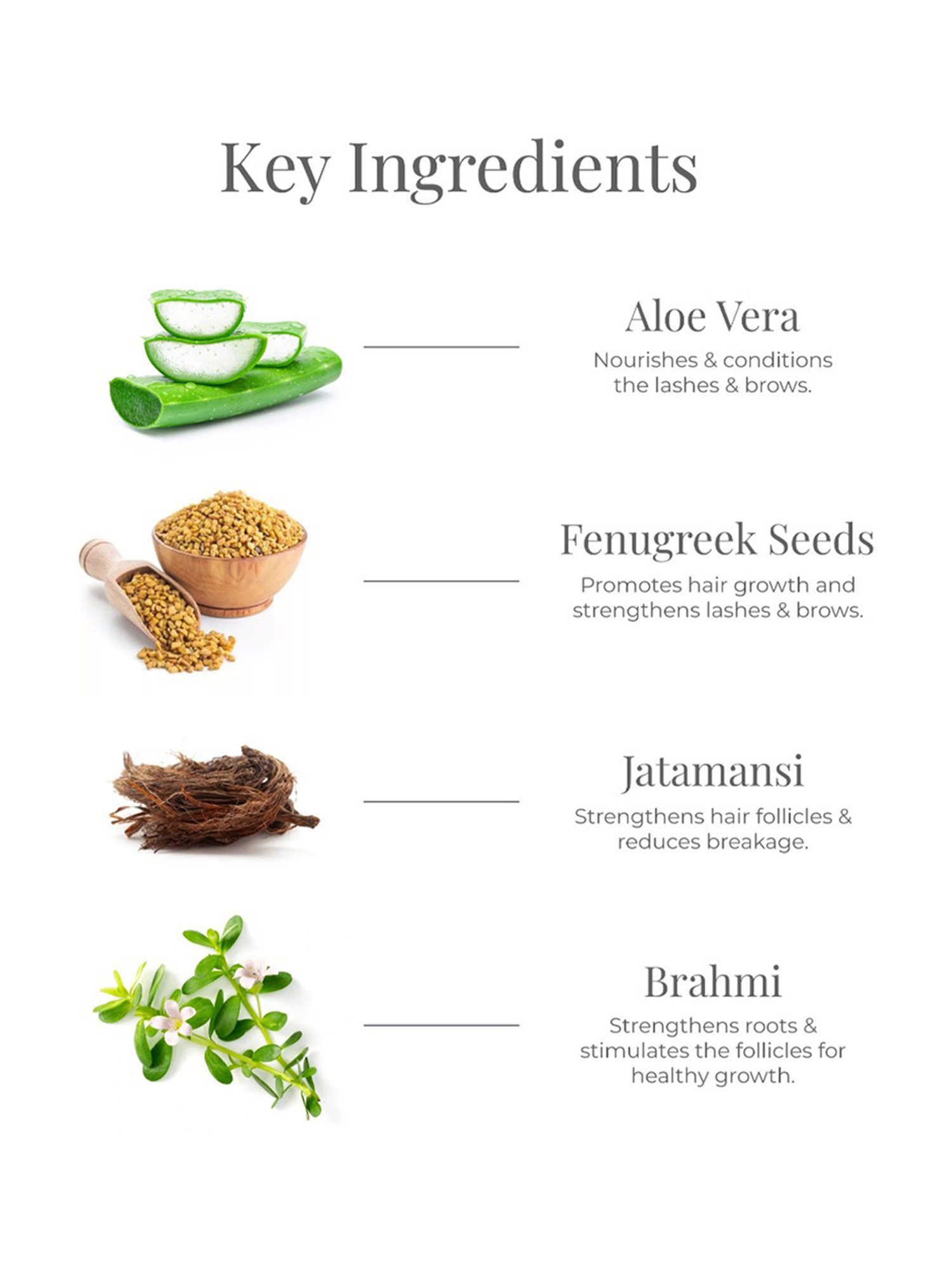 Composition: Aloe Vera Leaf Extract, Fenugreek Seeds Extract, Licorice Root Extract, Jatamansi Root Extract, Brahmi Extract, Moringa Extract, Amla Fruit Extract, Babchi Extract, Aqua, Castor Oil, Glycerin.