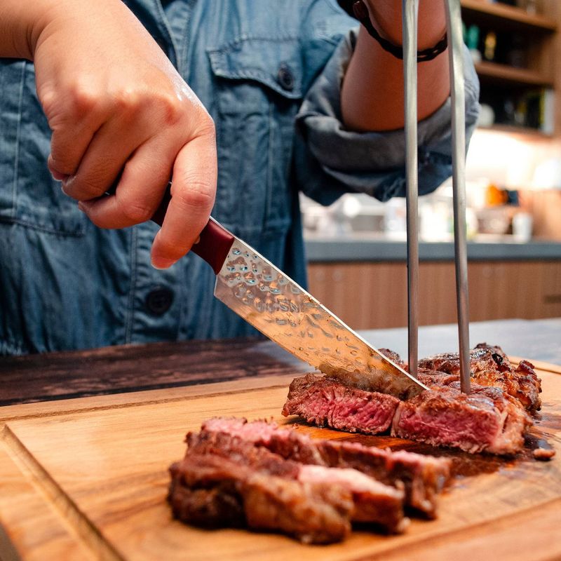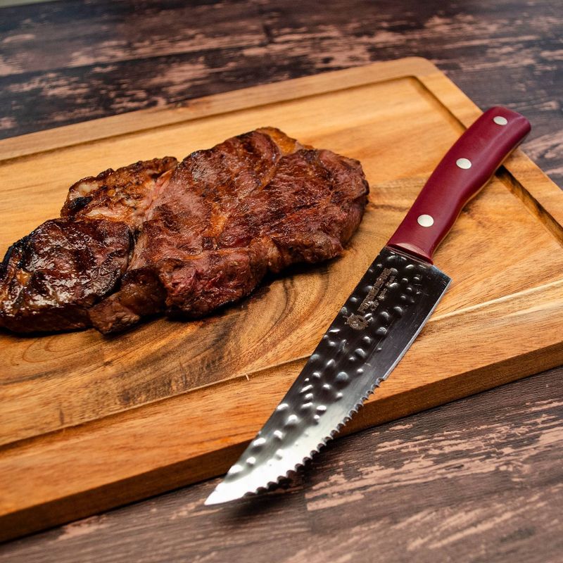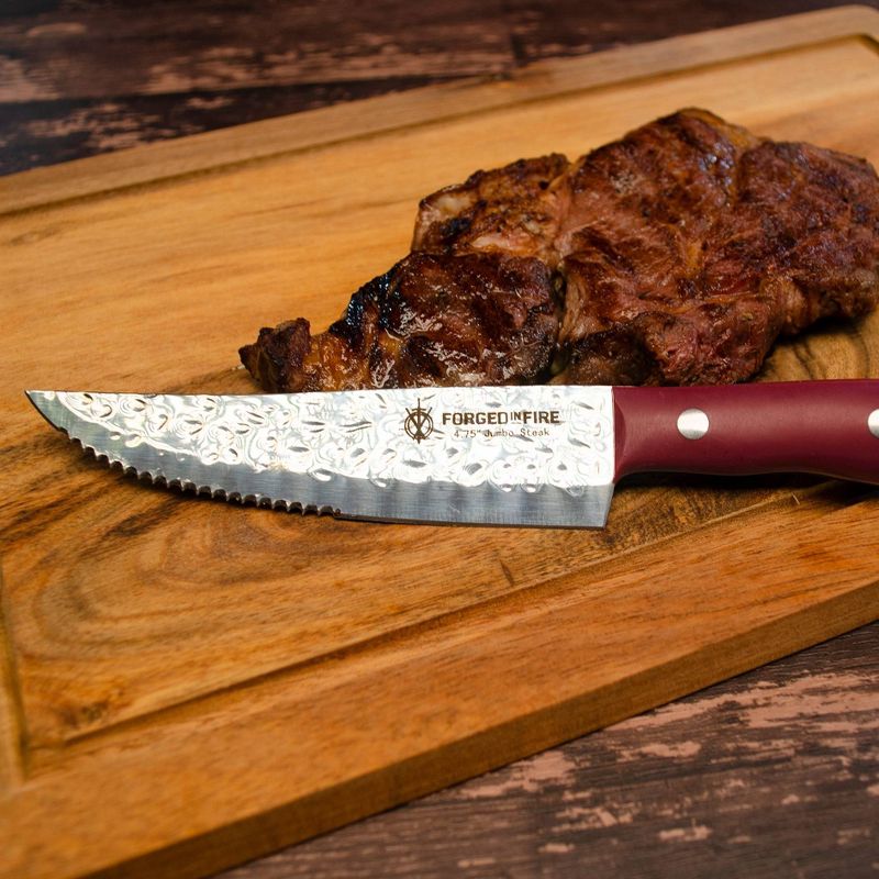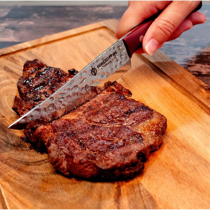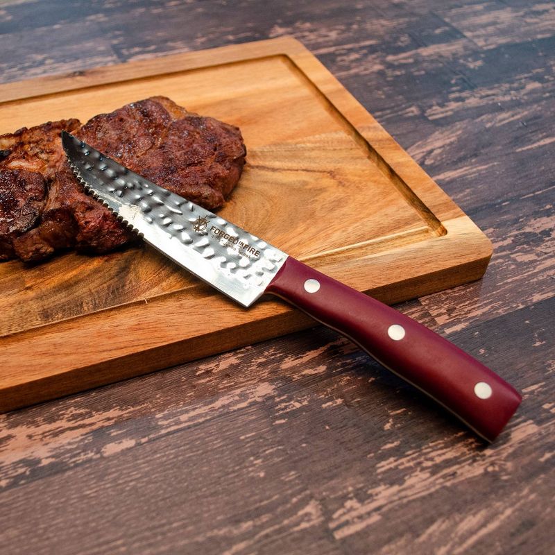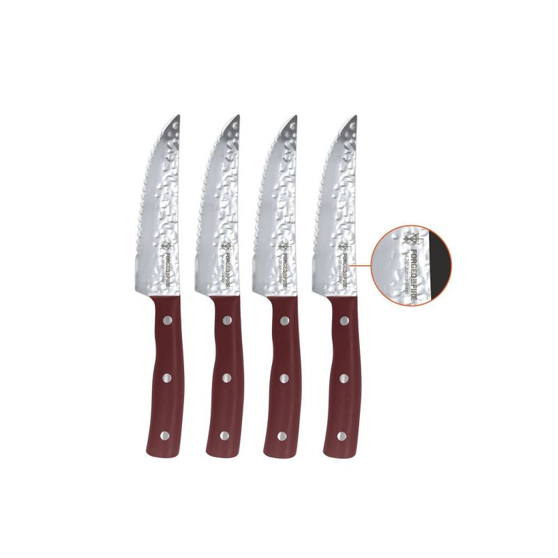 The Forged in Fire Full Tang Steak Knife Set’s steel finish and professionally sharpened blades can cut through almost anything in your kitchen. The Full Tang Steak Knife Set is one of the strongest and sharpest knife sets that you will ever get your hands on and the innovative steak knife design cuts smoothly through even the thickest ribeye.