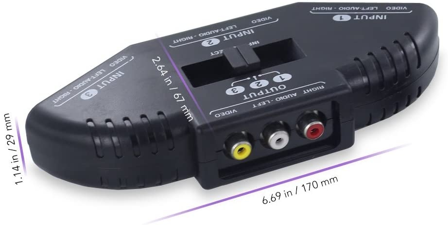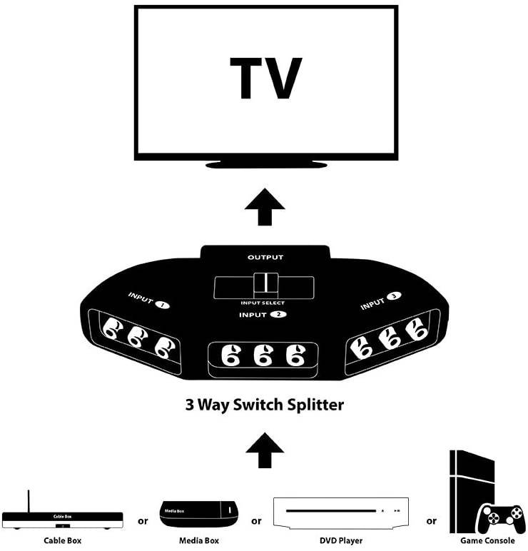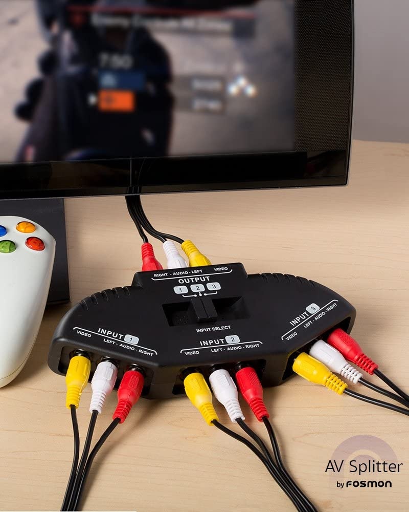 Enable your TV set to be connected with 3 peripheral devices, such as Xbox, DVD player, PS3 etc. Compatible with all devices that utilize RCA inputs such as your TV. No external power needed, easy to use. No need to unplug wires when switching between game consoles, DVD players, digital camcorders when using the 3 to 1 multi-switch3 RCA (Female) to 1 RCA (Female) port 3 way Audio/video switch/Splitter.