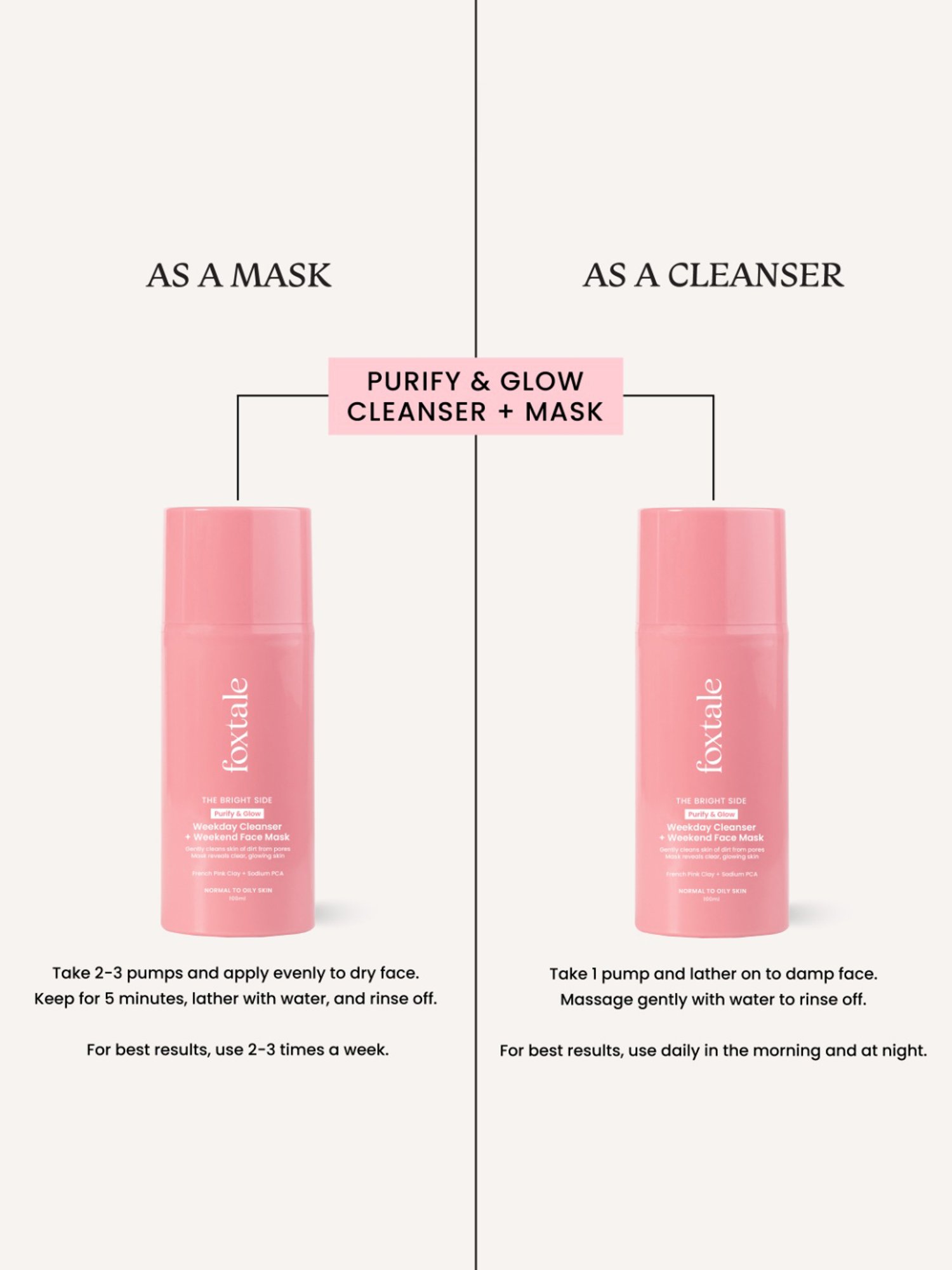 As a mask: Step 1 - Take 2-3 pumps and apply evenly to dry face. Step 2 - Keep for 5 minutes,lather with water and rinse off. As a cleanser: Step 1 - Take 1 pump and lather on to damp face. Step 2 - Massage gently with water to rinse off. |