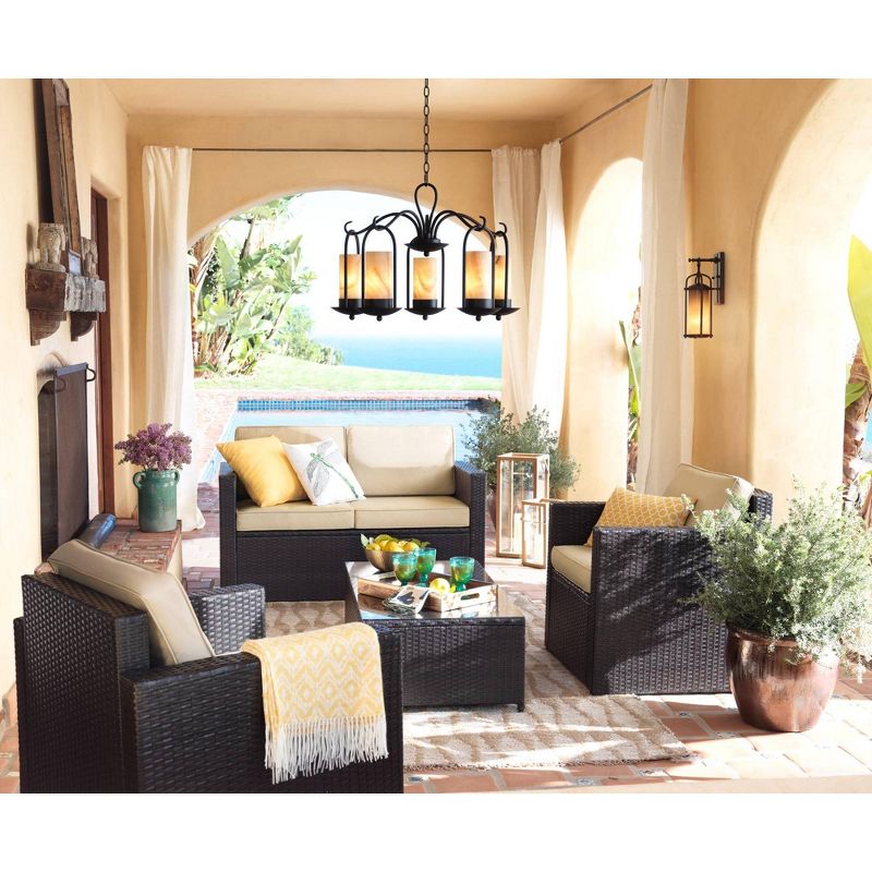 With a traditional ironwork design, this espresso outdoor chandelier offers classic styling for your porch, patio, or other covered exterior space. The graceful frame is presented in a deep espresso finish which is set off by gorgeous onyx stone faux candles, giving this fixture extra warmth and appeal. Looks just as good when used in indoor spaces.