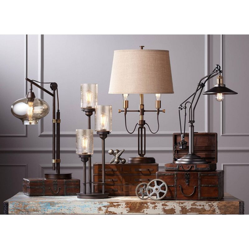 • Industrial modern table lamp from the Franklin Iron Works brand. Ideal for rustic or famhouse decorating.