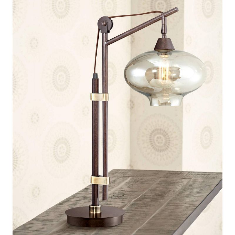 Add character and old-time charm to your living space with this industrial desk lamp. The design is crafted from metal and comes in a rich bronze finish with antique brass accents. A cognac glass shade surrounds a nostalgic Edison style bulb - the final vintage-style touch to this attractive lamp.