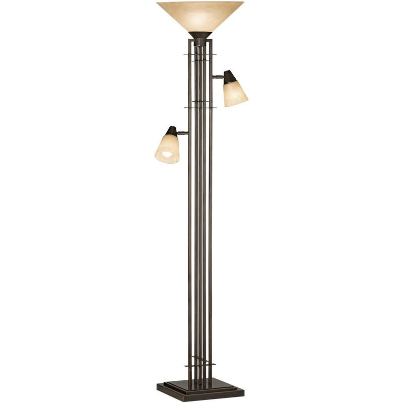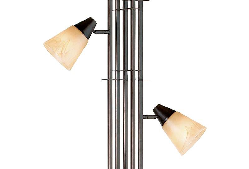 Task lamps help breathe new light into a room. This torchiere floor lamp stands tall with tiered bands of metal and champagne glass. Top torchiere light provides overall room illumination, while the twin side lights adjust for reading. Floor switch controls dimmer for top light and on-off button for side lights.
