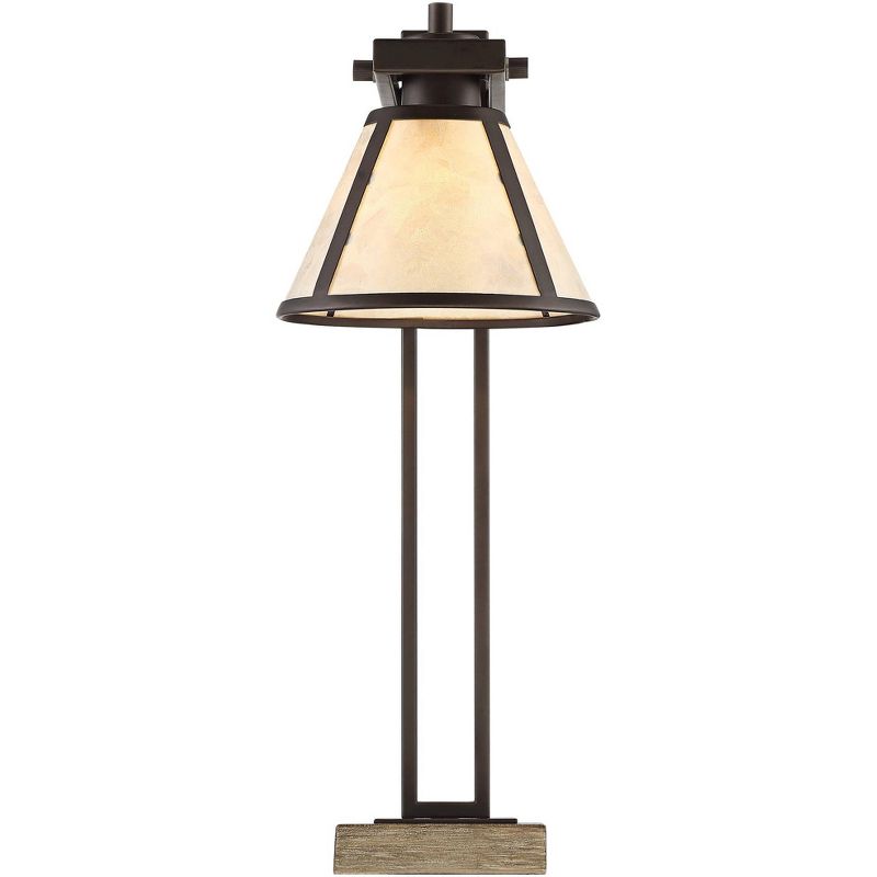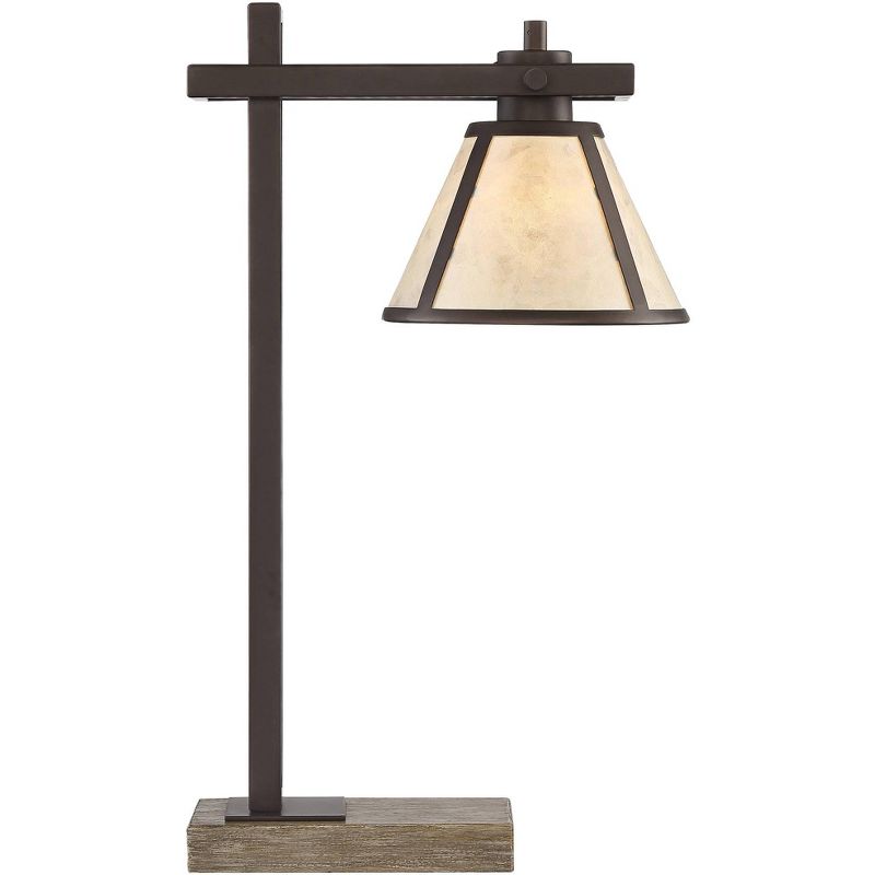 • Bronze and faux wood finishes. Metal construction. Blond mica lamp shade.