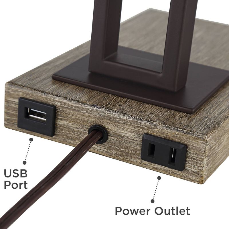 Brighten up your living space with this handsome industrial table lamp from Franklin Iron Works. It comes in a bronze finish metal column frame, set on top of a wood finish rectangular base. A blond mica shade hangs from the top, directing light downward, while a USB port and power outlet are built into the base.