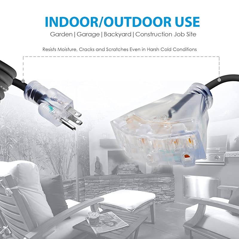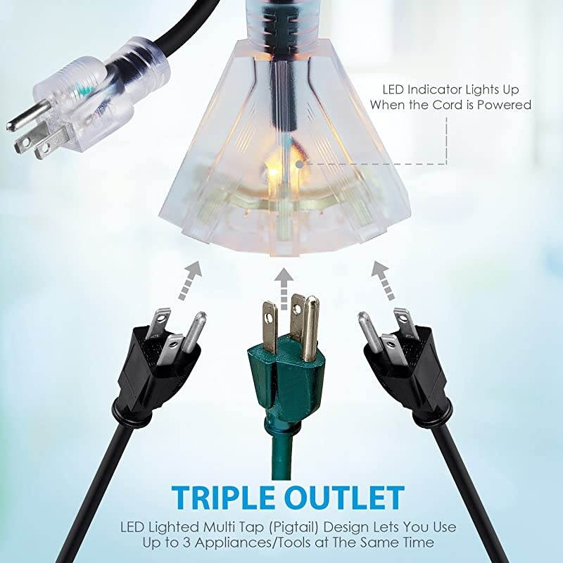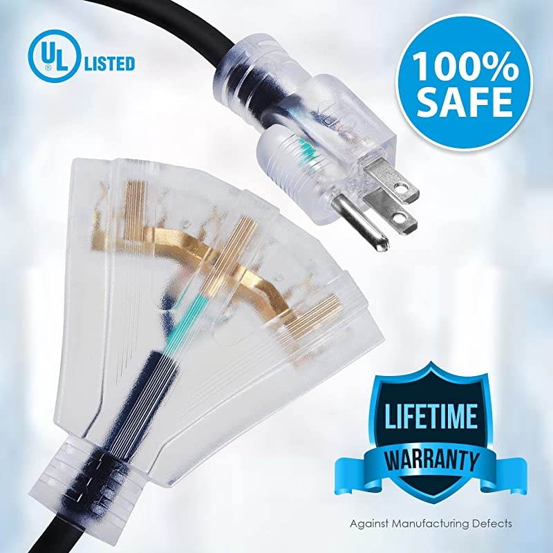 No time wasted on unplugging one tool to connect another, use all three at the same time. *****Built with 100% Copper Wire inside, rated for Amps, 1875 Watts and will handle heavy duty electrical equipment like a champ. *****Safety always first. This extension cord is UL listed for Indoor and Outdoor Applications. On top of that, we offe