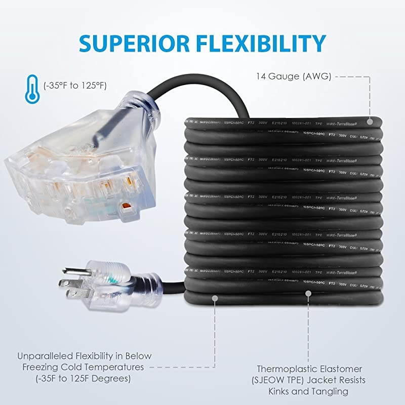 ***** **********Best Quality Guranteed. *****Easy to handle, flexible like Rubber. This ' 14/3 extension cord is really made with Rubber jacket (SJEOW TPE), which makes it very different from cheaper vinyl/plastic (SJTW) extension cords. *****Our ft extension cord is flexible at any temperature and compared to vinyl wires, it doesn't kink and has no annoying coil memory or stiffness even in below freezing cold. *****We make extension cords for professionals who need power to get the work done. Not only this foot extension cord is easier to handle, it is also more durable, abrasion, water and oil resistant and it powers up 3 outlets for 3 tools/appliances.