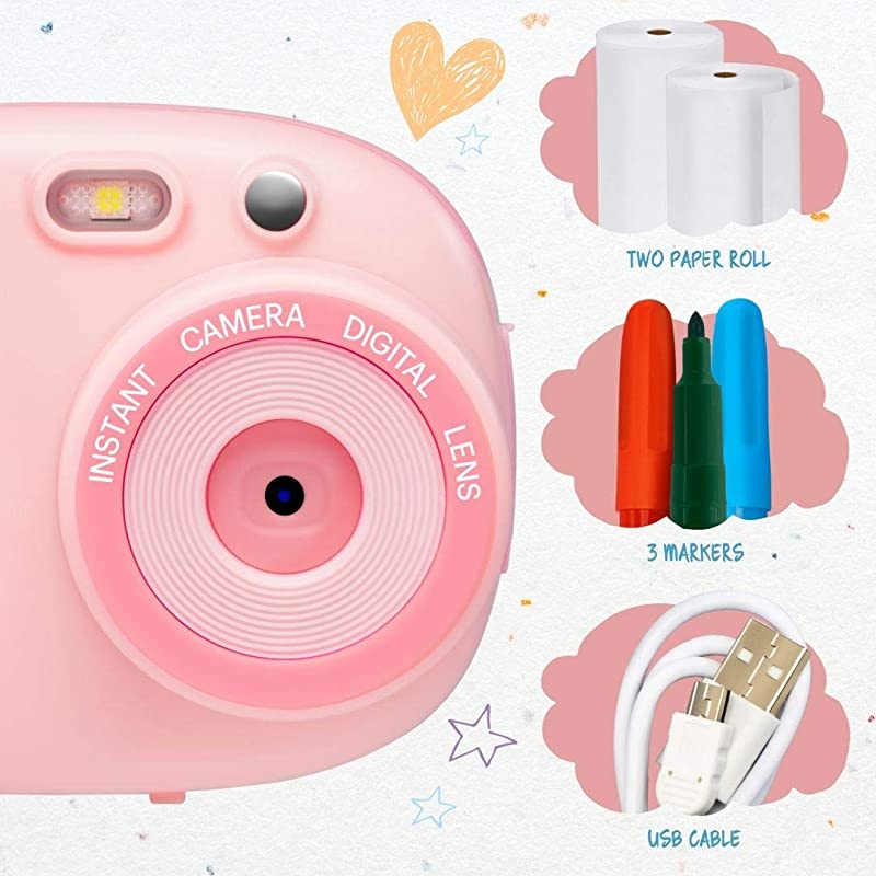 Color: PinkLittle shutterbugs lets get crafty! Does your child love snapping photos, playing with friends, coloring pictures or watching videos? No matter their interest or skillset, the amazing Crafty Cam from provides endless opportunities for creative, collaborative play! Perfect for young photographers in training, this mini rechargeable camera and thermal printer combo is much more than a toy. In fact, its powerful 5MP CMOS sensor, 1080p video recorder and easy-to-use LCD screen teach kids how to capture, edit, review and print photos before unleashing their creative sides! Its the perfect mix of education and entertainment. Watch as your tot snaps a picture, chooses a cool border frame, prints their creation and transforms it into a colorful masterpiece with the provided markers. While the set includes enough paper for 150 photographs, you can also buy our regular or sticky-back refill rolls for years of enjoyment.
