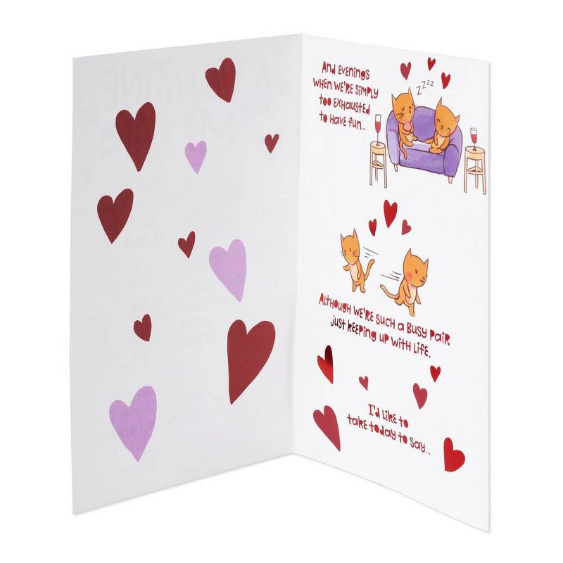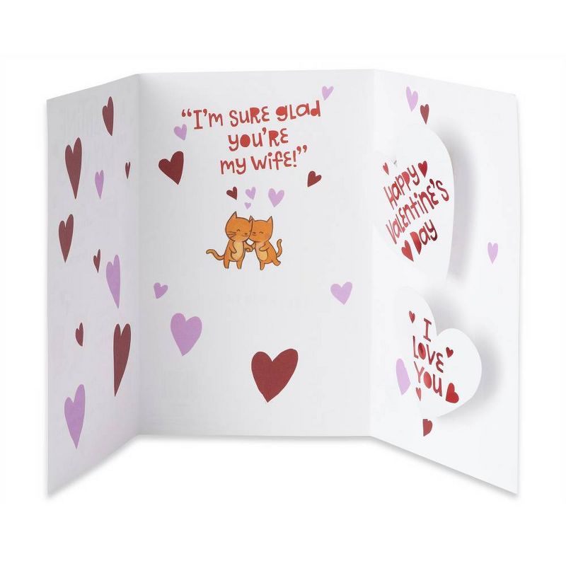 •This Wife Valentine's Day greeting card features a tri-fold design with cute illustrated scenes, red foil accents and pop-up hearts on springs