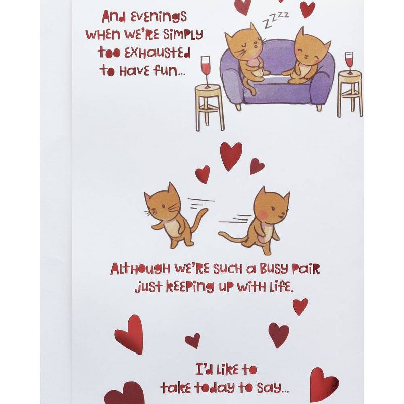 Take time to celebrate your wonderful wife! This cute and funny Wife Valentine's Day card features a tri-fold design that opens with sweet illustrations and relatable scenes that lead to a heartfelt 'I love you.' Pop-up hearts on springs and shimmering red foil embellishments add surprise touches. It's the perfect way to express how much your wife means to you. Share Valentine's Day cards by American Greetings and make every heart happy!