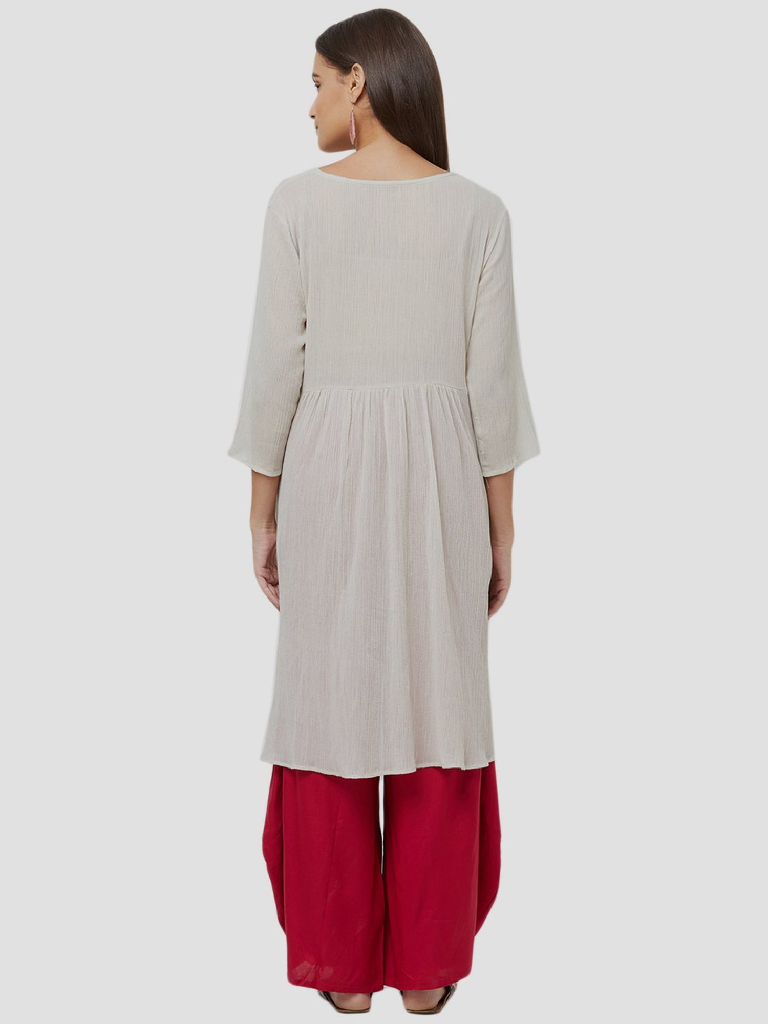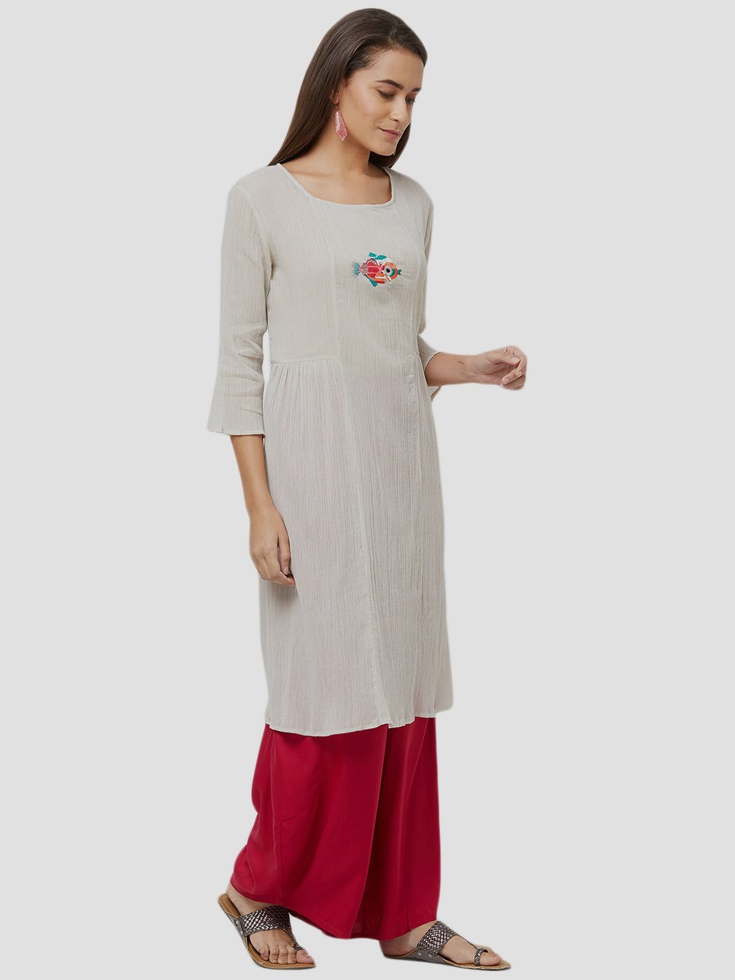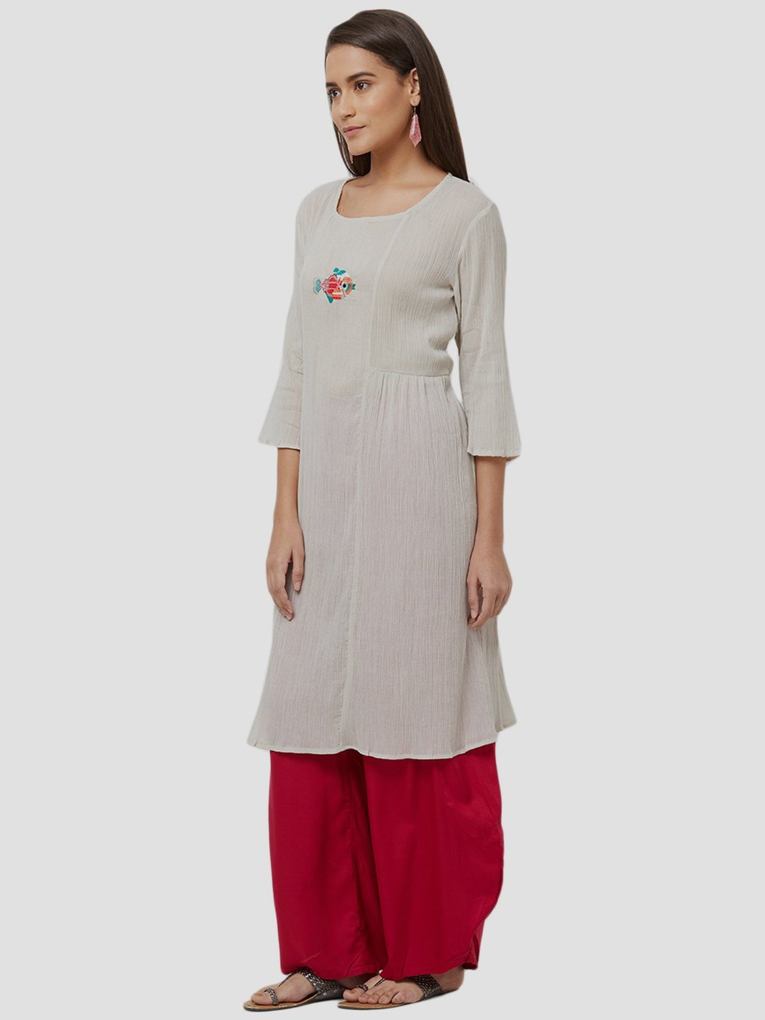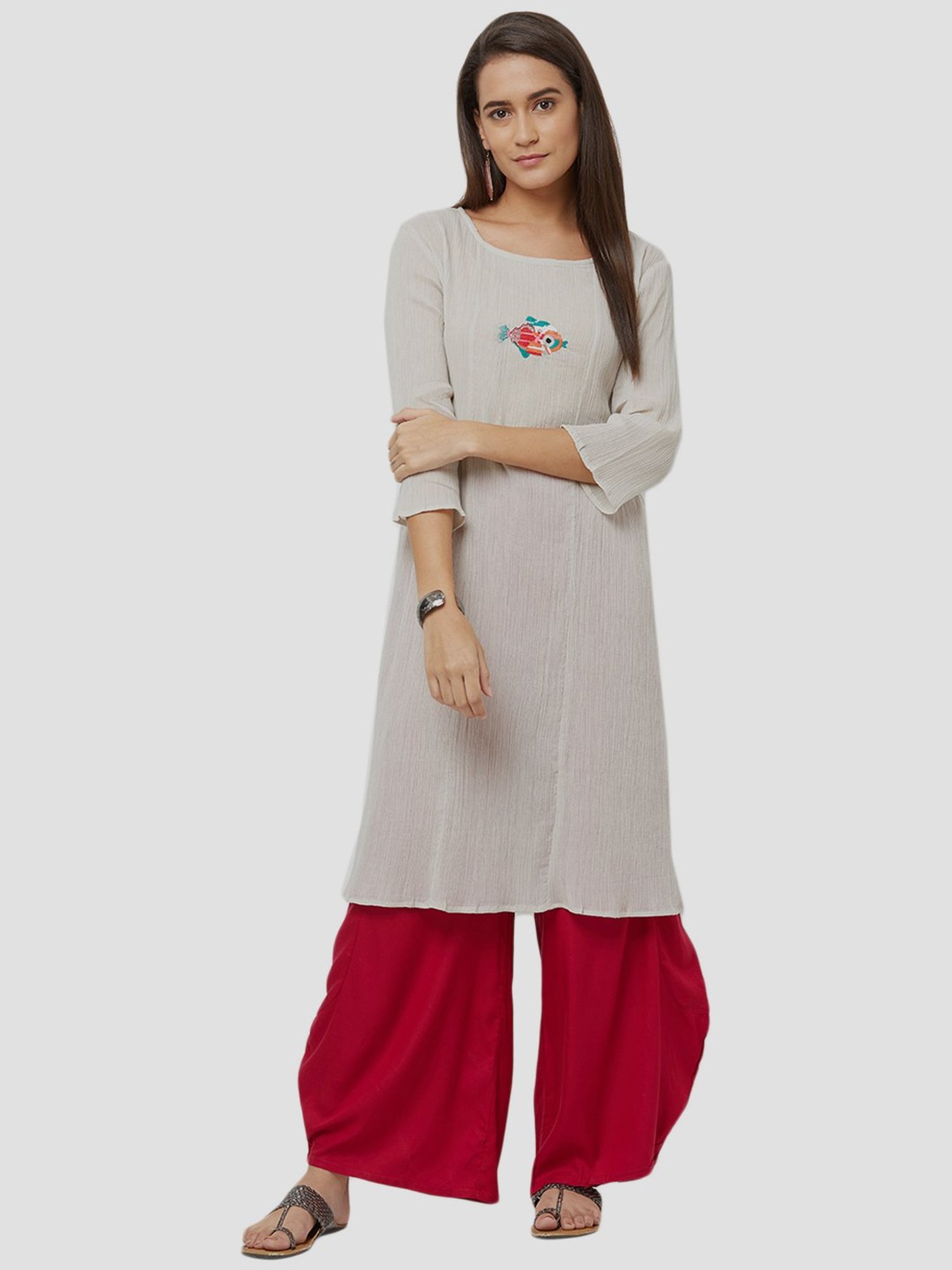 Get ready to be overwhelmed with a flurry of compliments by wearing this light grey kurta from Fusion Beats. Tailored to sartorial perfection from premium quality fabric, it assures a soft and soothing touch against the skin. The boat neck elevates its design. The three-quarter sleeves further speak for itself. The embroidery work speaks for its ornate artistry.