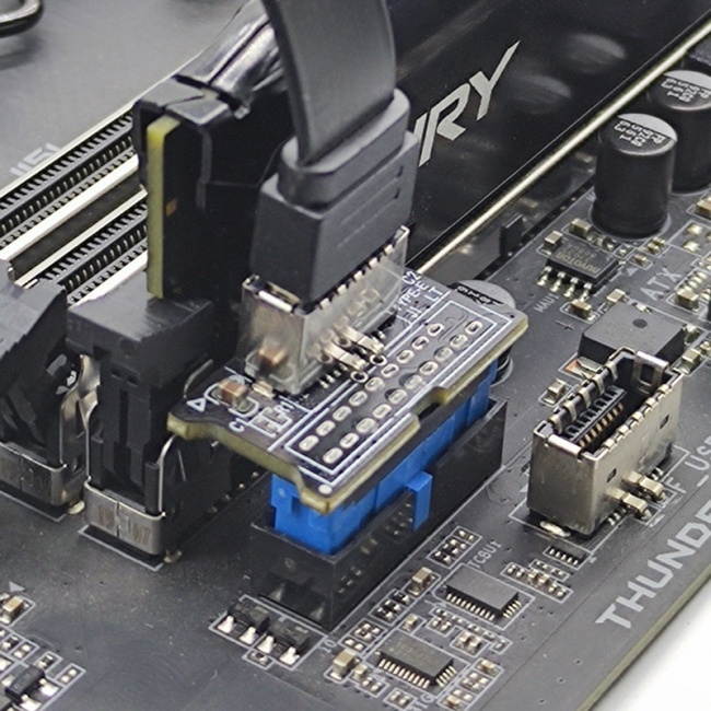 The small converter is plugged into a USB 3.0 header that provides two USB 3.0 lanes.