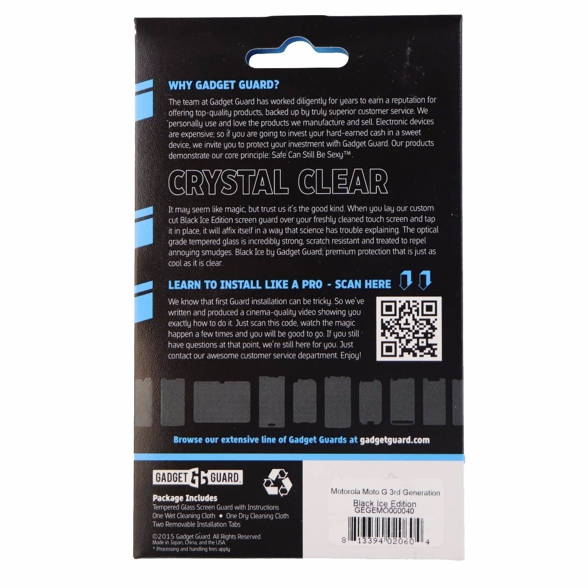 The Black Ice Edition Tempered Glass Screen Protector made by Gadget Guard. Made for Motorola Moto G (3rd Gen.