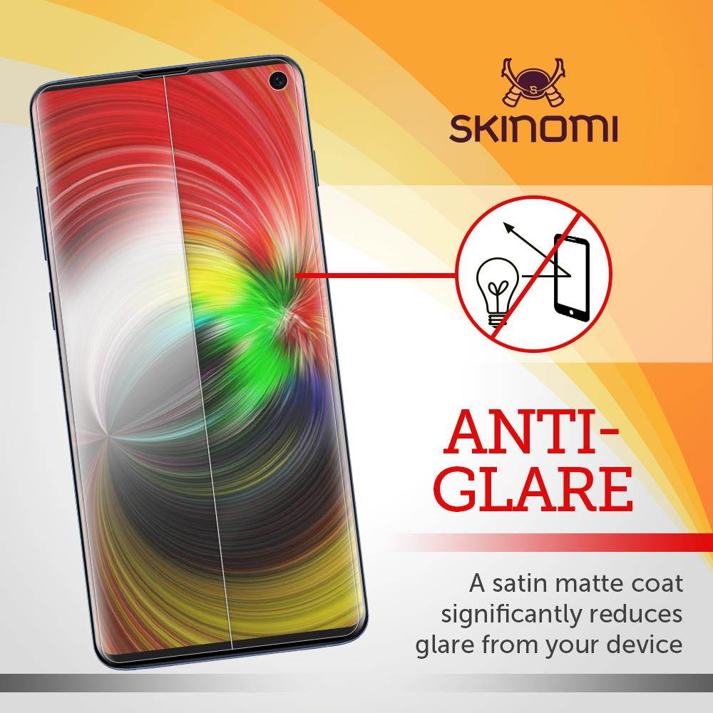 Skinomi MatteSkin offers Skinomi enthusiasts a new and unique way to keep their devices protected. The Skinomi MatteSkin Galaxy S10 matte screen protector is engineered to help greatly reduce glare and to significantly diffuse sunlight. Thanks to the edge to edge coverage, this anti-glare protector offers superior protection while also providing the clearest visibility in bright environments. Featuring some of the same technologies found in the original TechScreen such as "self-healing" and "anti-yellowing"; each MatteSkin protector is made of elastic polymers which is then layered with a protective coating to allow fine scratches and marks disappear over time while keeping its smooth, lasting finish.