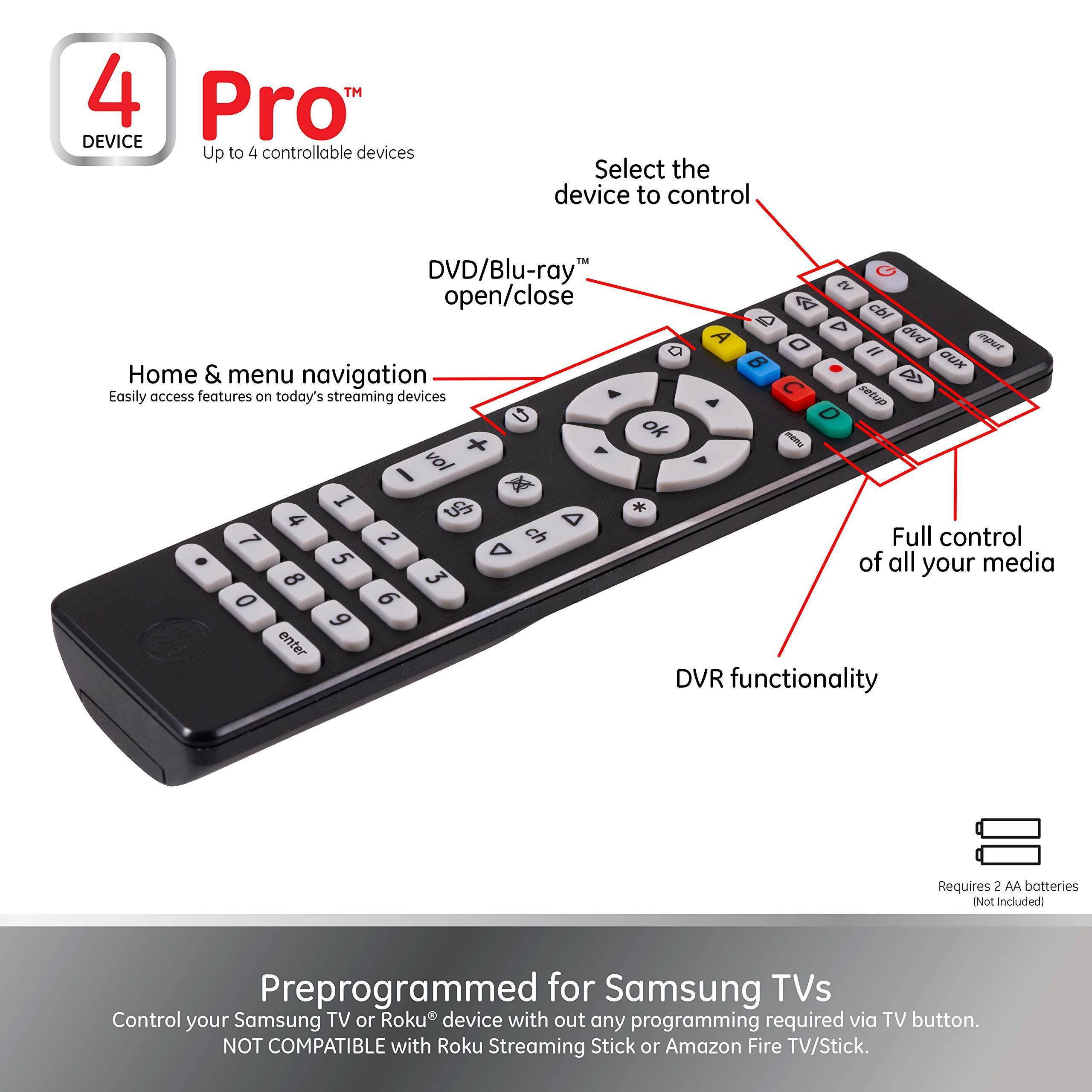 GE Universal Remote Control for Samsung, Vizio, LG, Sony, Sharp, Roku, Apple TV, RCA, Panasonic, Smart TVs, Streaming Players, Blu-ray, DVD, Simple Setup, 4-Device, Black, 34457