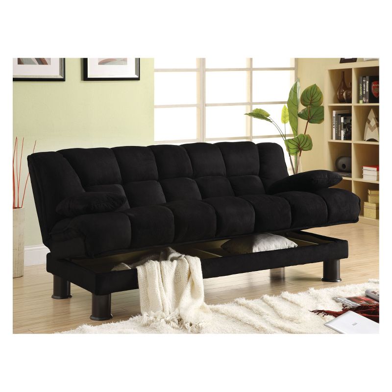 The HOMES: Inside + Out Gem Futon Sofa in Black features a cozy elephant skin microfiber upholstery with deep grid tufted design. Comfy pillow top arms create perfect hear rests when converting the futon into a bed while underseat storage provides ample storage for fresh sheets, blankets and extra pilows. Crafted with a patented hidden support leg for lasting support, the HOMES: Inside + Out Gem Futon Sofa in Black is sure to be your new favorite resting spot!