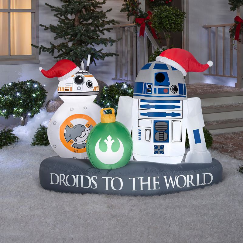 Deck the yard with an Airblown® Inflatable R2-D2 and BB-8 scene! A must-have for fans of Star Wars, this iconic inflatable makes an eye-catching addition to your Christmas decorations. Includes Santa hat accents, an ornament and a "Droids to the World" sentiment. Setup is super simple. Just plug it in, stake it down and watch the magic unfold. Display this irresitible indoor or outdoor decoration as a standalone or combine it with other Airblown Inflatables to create a custom scene. Includes everything needed for easy outdoor setup.