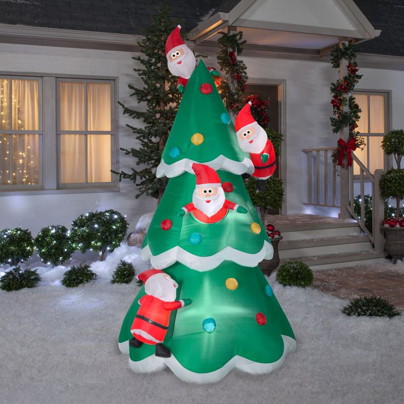 Deck the yard with this hilarious Airblown® Inflatable Christmas Tree of Many Santas. Featuring little Santas climbing everywhere, this charming inflatable makes a wonderful addition to your Christmas decorations. Setup is super simple. Just plug it in, stake it down and watch the magic unfold. Display this whimsical Christmas tree as a standalone or combine it with other Airblown characters to create a custom scene. Includes everything needed for easy outdoor setup.
