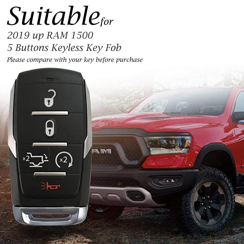 Suitable Key: 2019 - 2020 RAM 1500 5 Buttons Keyless Smart Key Fob with Tailgate Button This Leather key case by is the perfect way to provide full protection and fashion to the smart key of your vehicle. It is constructed from durable, high quality materials, with vibrant colors that are easily cleaned with soap and water.