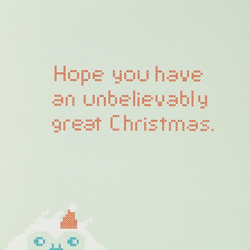 •From American Greetings, this Present Company Christmas card features a yeti character, colorful cross-stitch patterns and textured paper stock