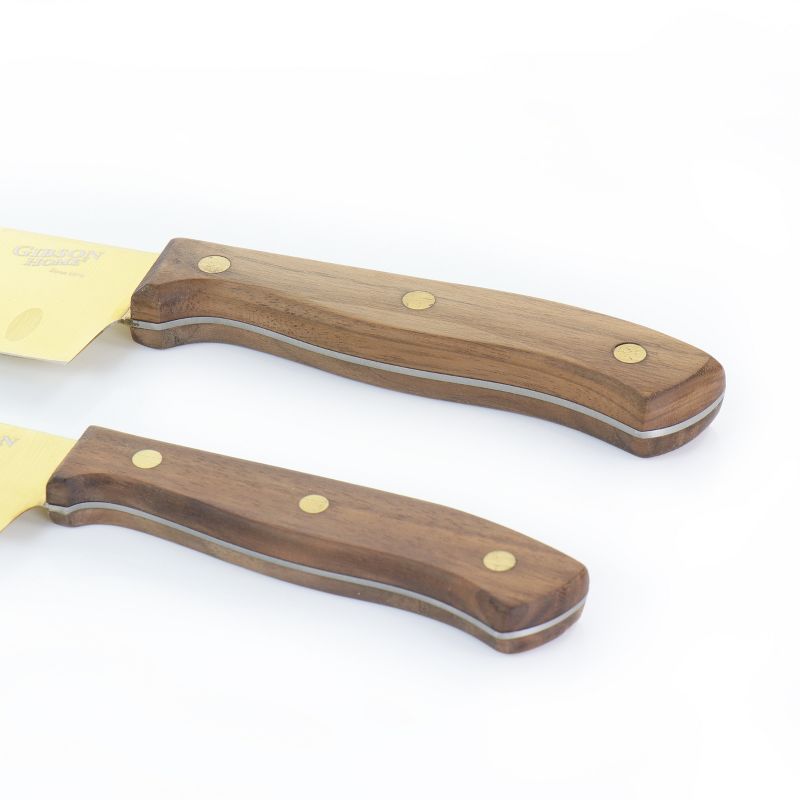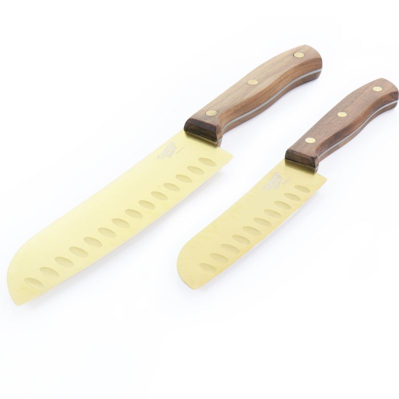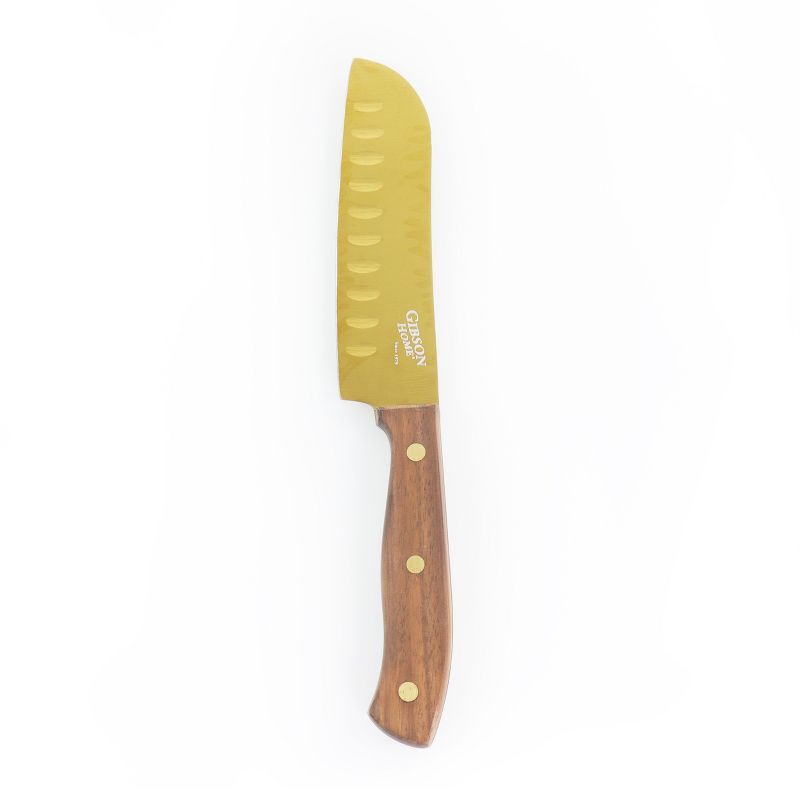 Add a touch of style to your kitchenware collection with the Gibson Home Alaniz 2 Piece Titanium-Plated Santoku Knife Set in Gold. This set comes with one 7 inch Santoku Knife and one 5 inch Santoku Knife. Each blade in this collection is crafted from titanium plating and paired with triple-riveted ergonomic black walnut handles, making each knife both durable and stylish.