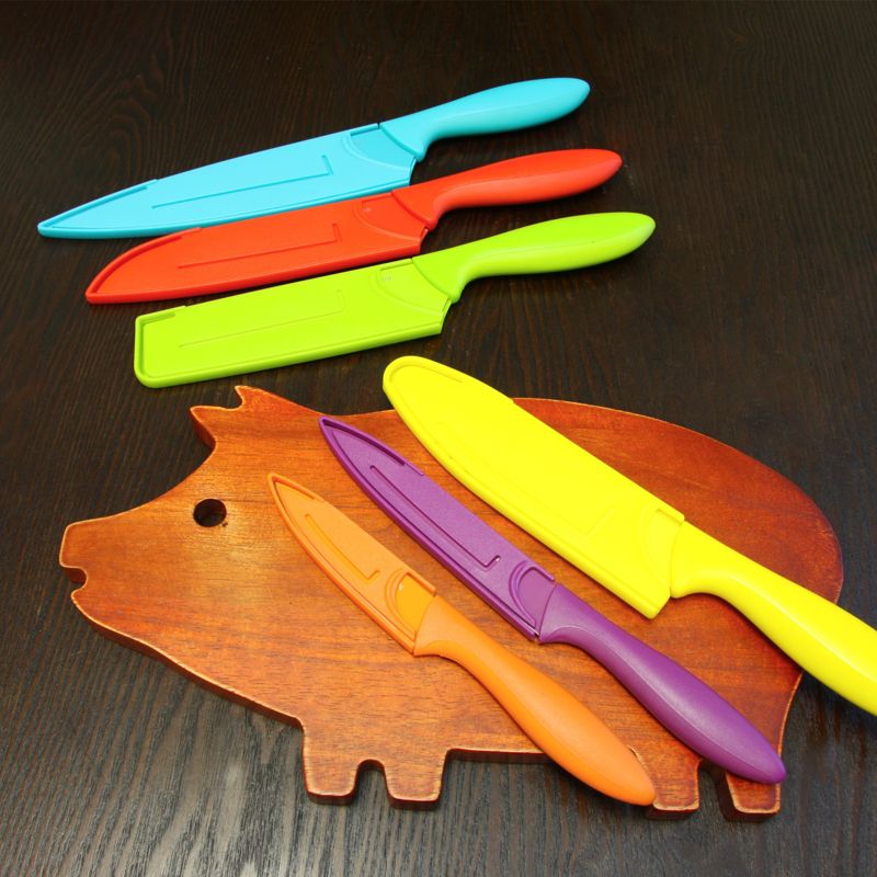 This beautiful set of multi color stainless steel knives are not only sleek, but highly efficient. Featuring nonstick, stain and rust resistant blades for smooth slicing and cutting. The thermoplastic and polypropylene handles are ergonomically contoured for perfect comfort while cutting. Each knife in this set is color coded to reduce the risk of cross-contamination during food preparation. Your safety is always important to us, which is why each knife comes with a protective sheath for safe storing.
