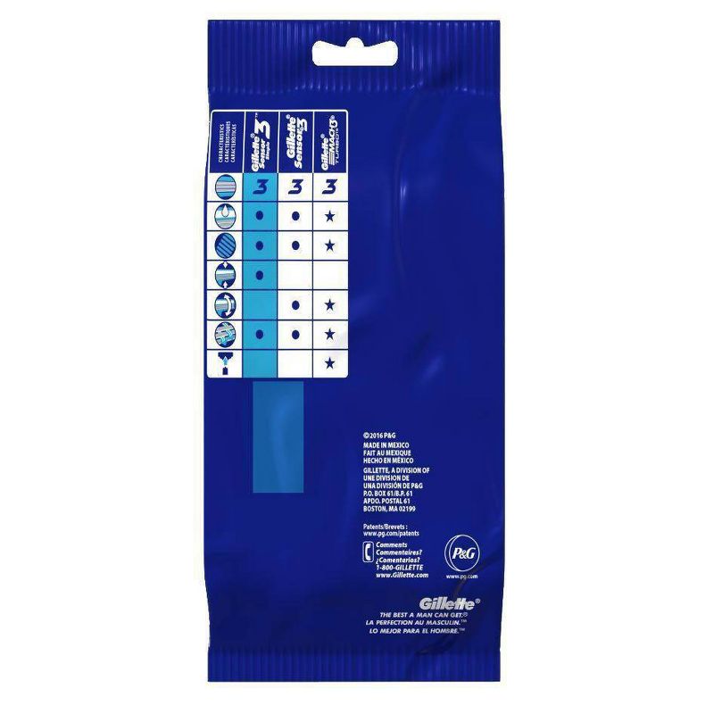 Disposable razor that can get you up to 10 comfortable shaves? Gillette's Sensor3 does that thanks to 3 chromium-coated, skin sensing blades and a pivot head that adjusts to the contours of your face. Its enhanced Lubrastrip with water-activated Comfortgel technology provides you with the ultimate comfort. The razor features an anti-slip rubber handle for control and maneuverability and easy rinse blades for 2x better rinsing*. *vs. Sensor2 Plus