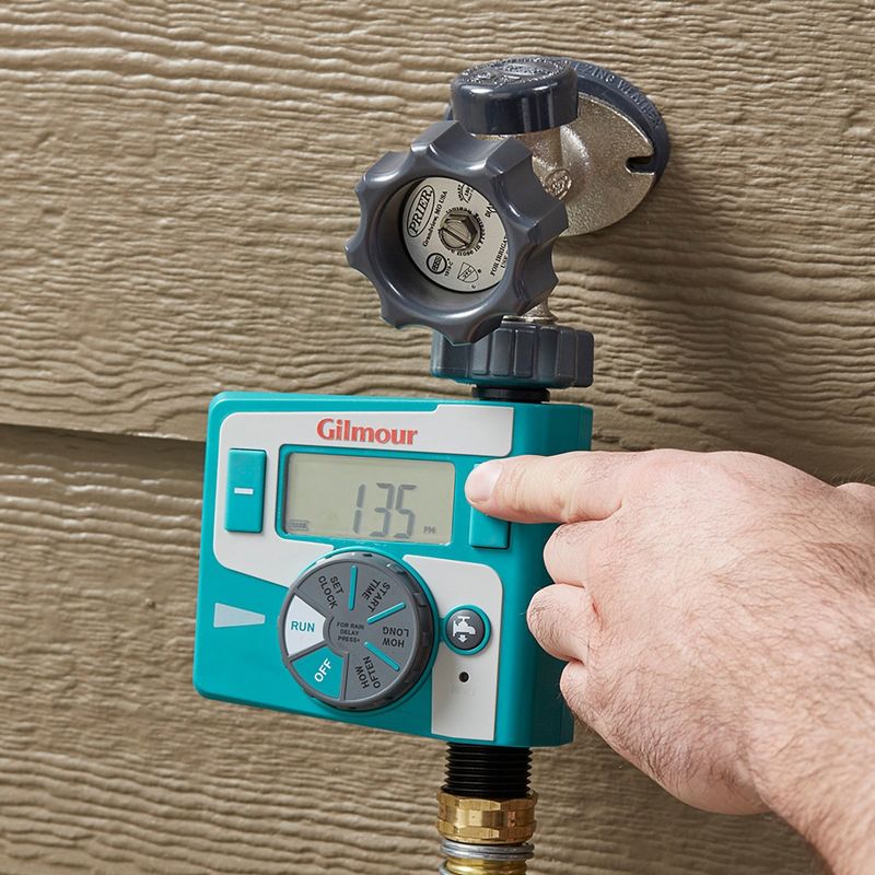The ultimate time-saving, water-saving, money-saving tool for your lawn and garden. A timer automatically turns water on and off when you want it to. This Gilmour Single Outlet Electronic water Timer is simple to set and easy to use. It features a large LCD display with easy-to-read numbers and text making programming a breeze. The timer shuts off automatically after the programmed time has elapsed. The rain delay feature give you the ability to delay watering for 24, 48 or 72 hours. The On/Off function allows for manual watering. Constructed of durable high impact plastic, the timer eatures a metal swivel connection to the faucet that allows you to safety pull the hose around the yard without damaging the timer.