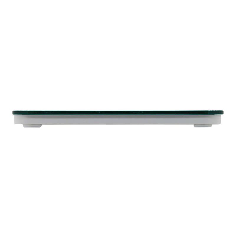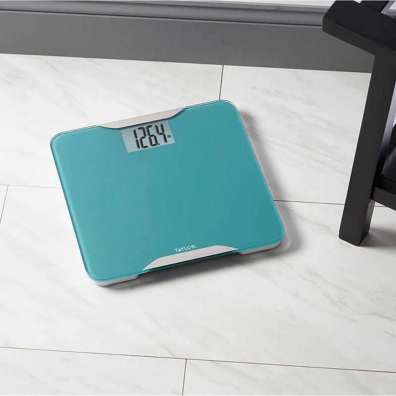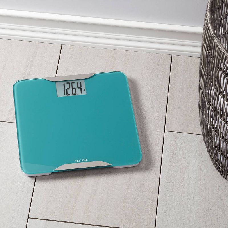 Taylor's tranquil ocean green glass and brushed stainless steel design features an 11.8" x 11.8" platform made from durable, tempered glass with curved corners. The 2.9" x 1.9" display is easy to read. Provides a high 400 lb capacity reading in 0.2 lb increments. The Step-on Technology feature means no need to tap the scale before taking a reading. Simply step on the scale to engage. 2 AAA batteries and 5 year limited warranty included. Taylor delivers style and accuracy.