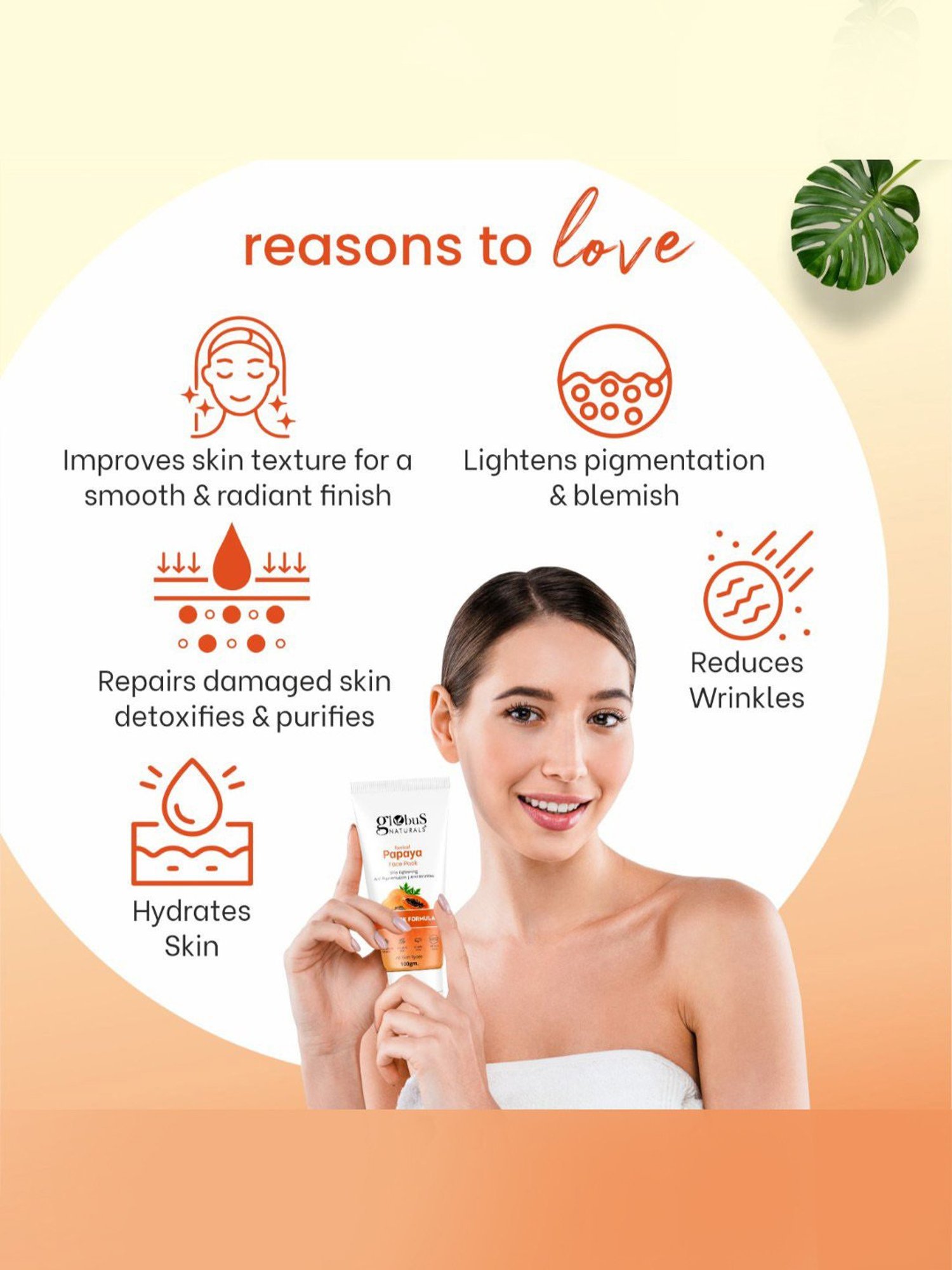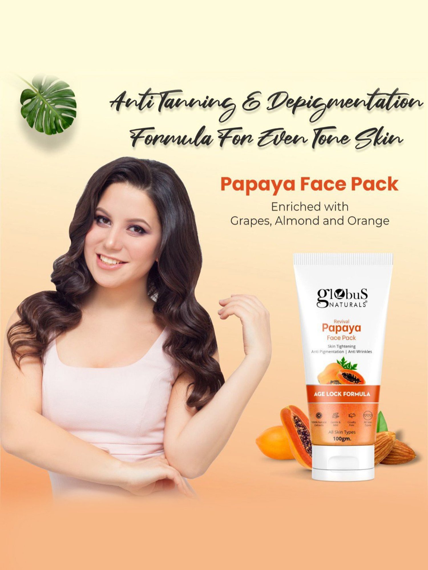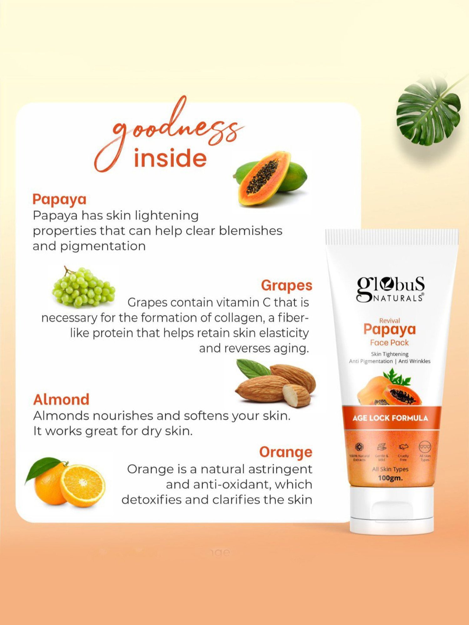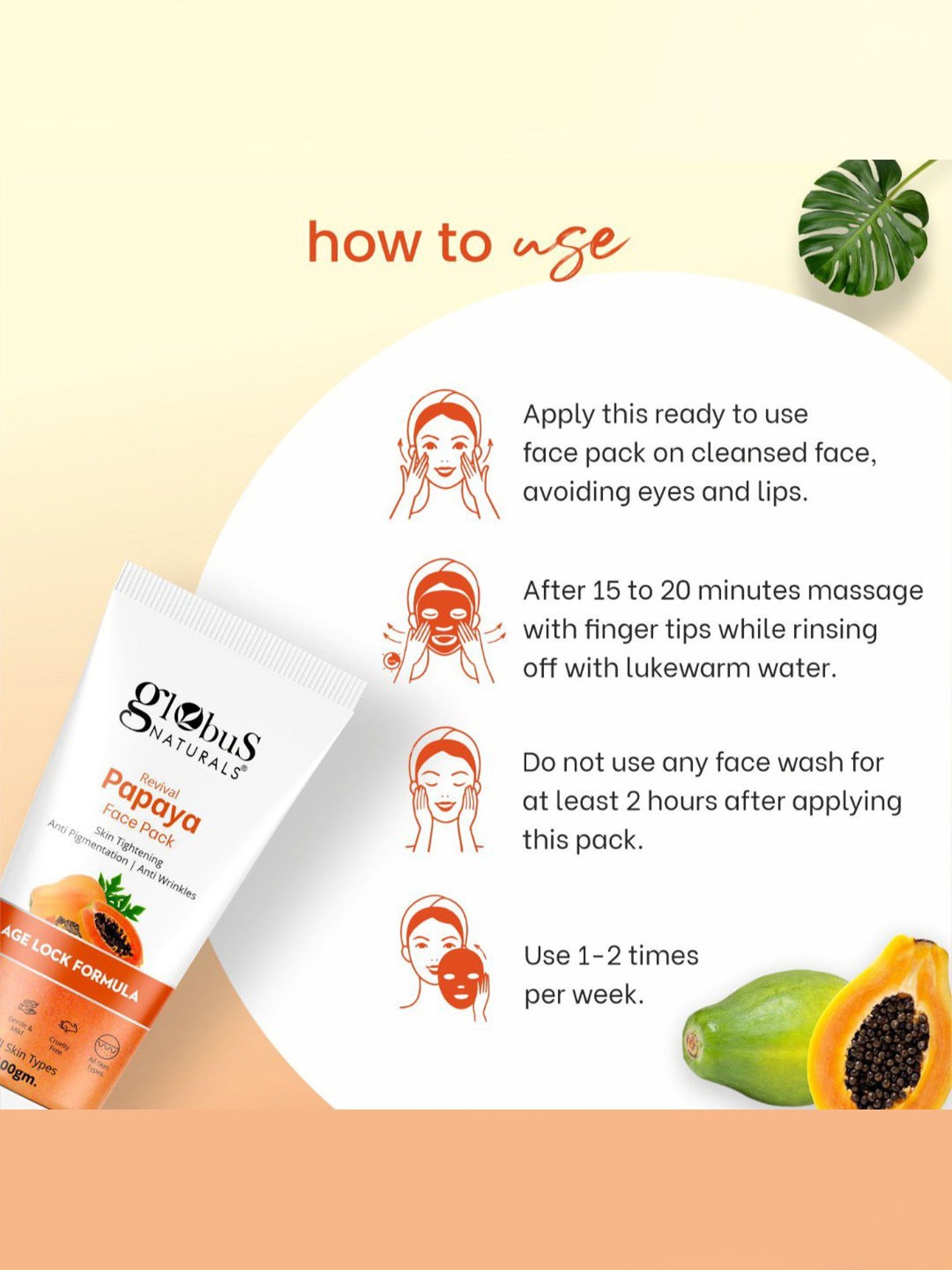 This Globus Naturals Revival Papaya Face Pack also detoxifies and purifies skin by removing toxins and harmful pollutants. Papaya helps to lighten pigmentation spots and blemishes while aloe vera repairs skin damage. It revitalizes tired skin and improves overall skin texture. This Globus Naturals Revival Papaya Face Pack works against uneven skin tone, patchy skin, dark spots and dullness. It helps reduce pigmentation and controls acne breakouts and wrinkle formation. This pack contains 2 X Globus Naturals Revival Papaya Face Pack - 100 gm.