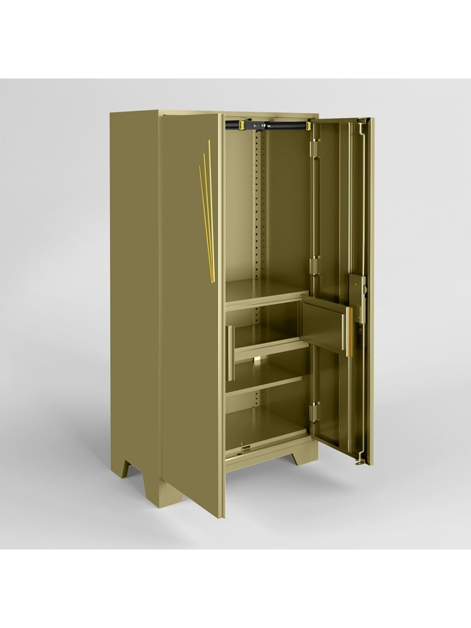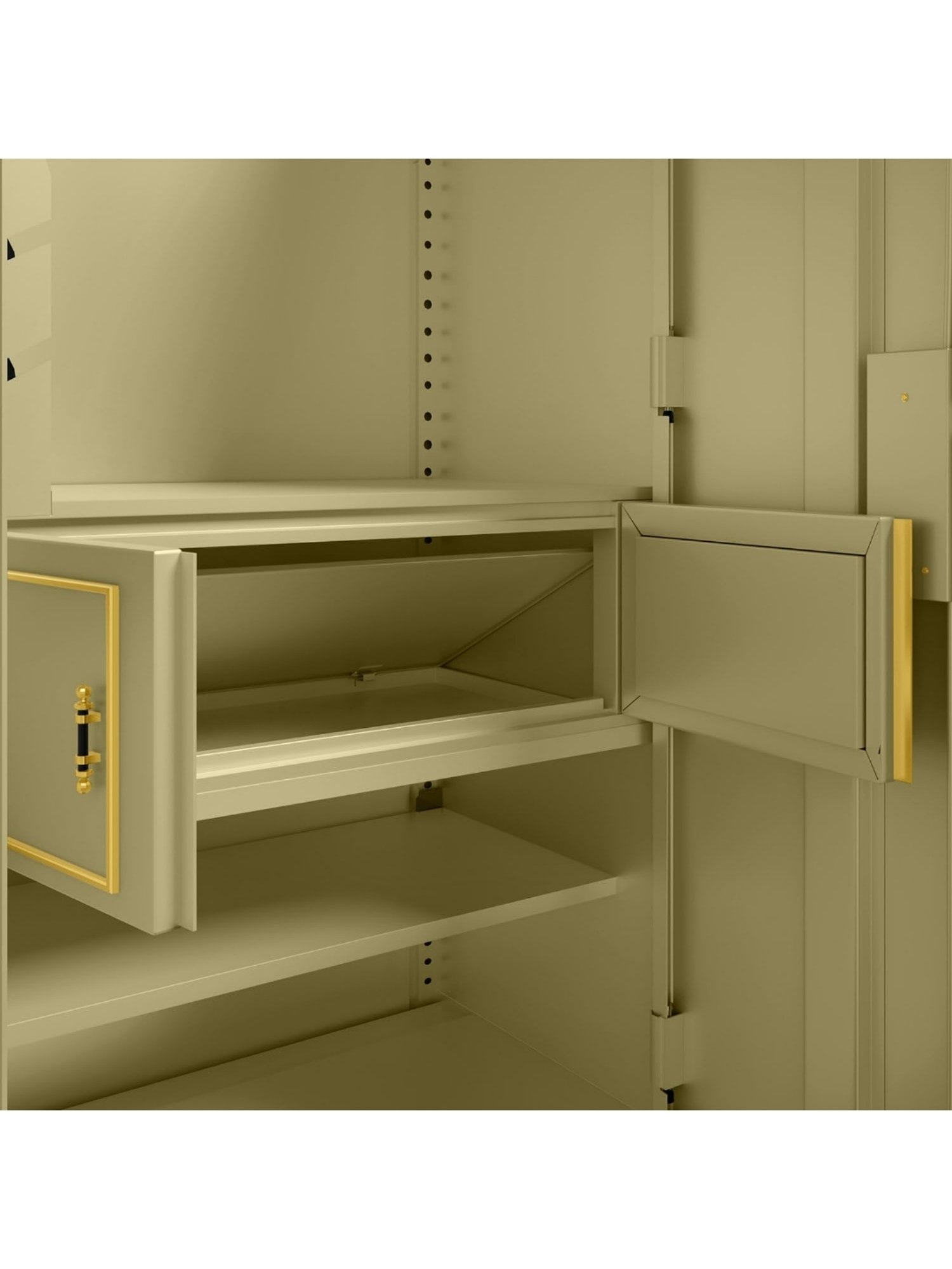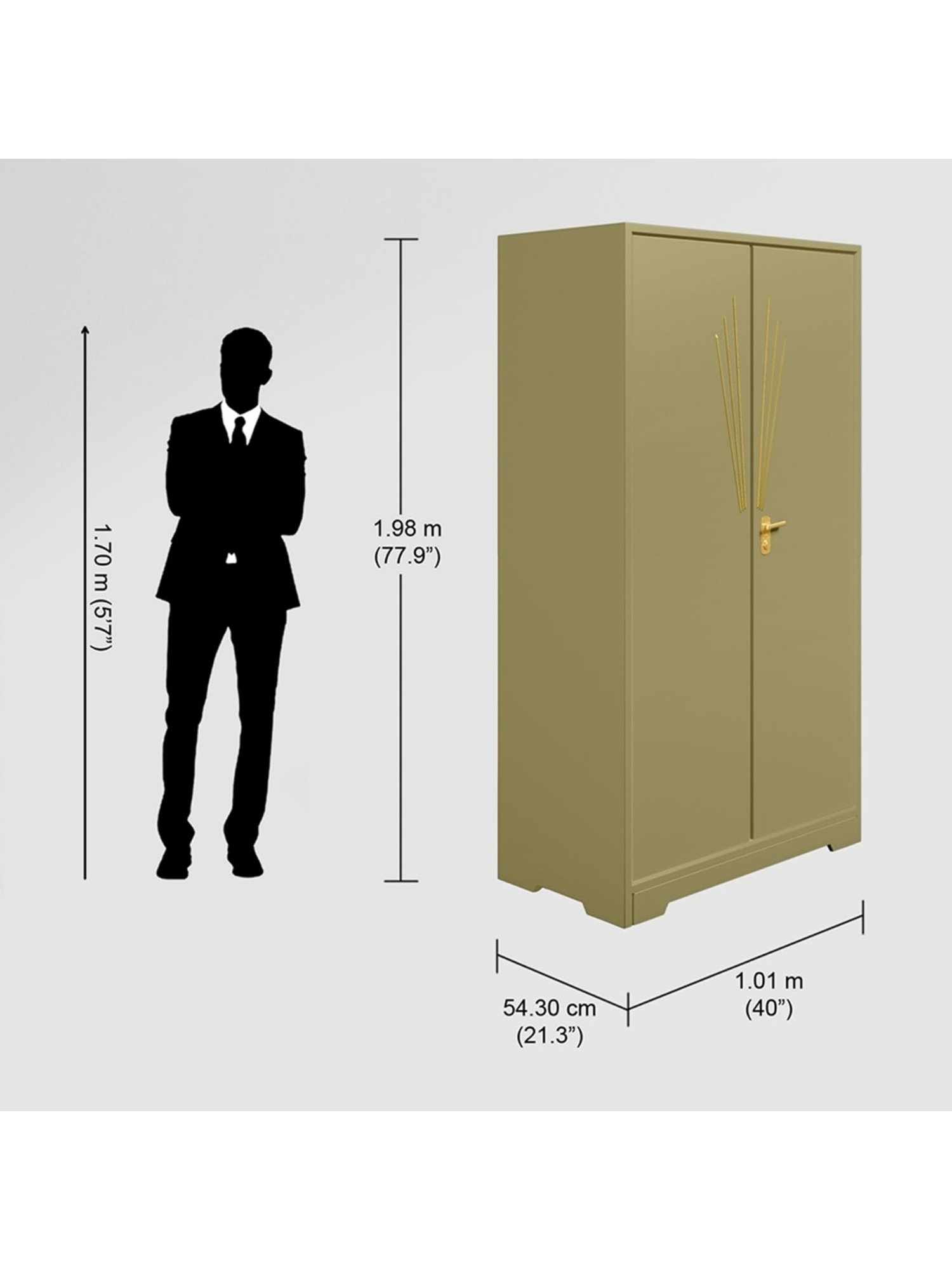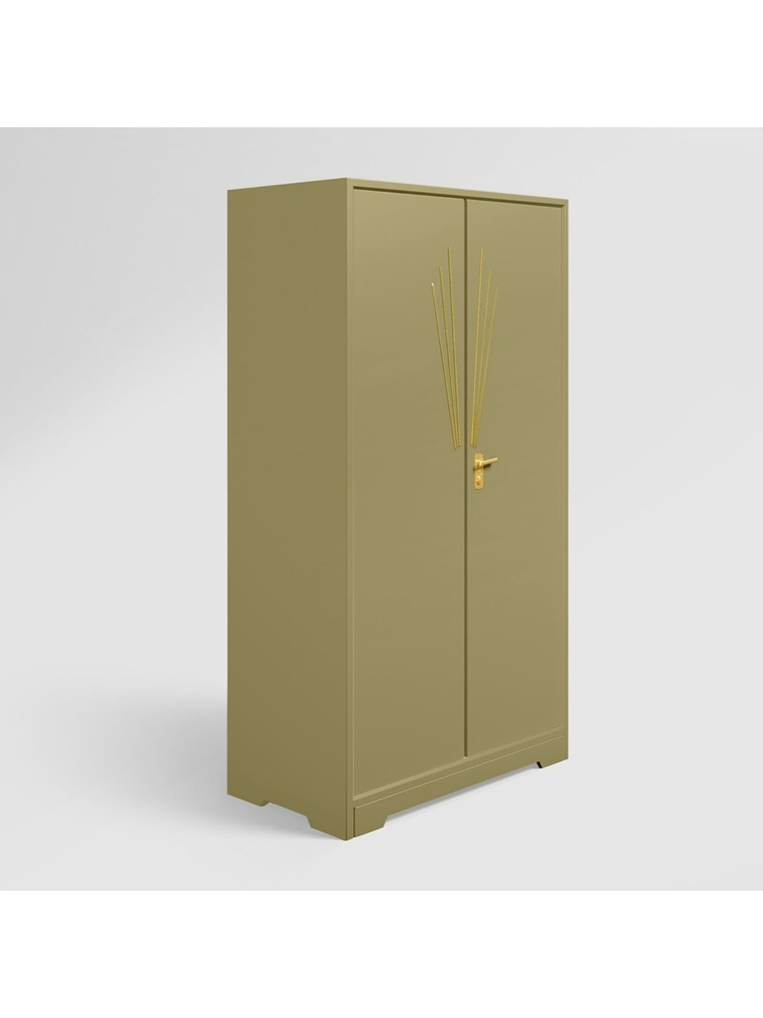 The main doors feature stunning brass strips which lend elegance to this piece of furniture. The use of brass is followed through to the handles, which shimmer with the same make. The CRCA steel parts, making it a sturdy & durable build that is known for its longevity. Within the confines of the steel almirah is a secret compartment, which is lined with a velvet linen spread for storing jewelry. Using high-security spring less locking technology, the EXS lock is one of a kind, being virtually non-duplicable Inside the almirah is a motion sensor LED light that requires no electrical wiring.