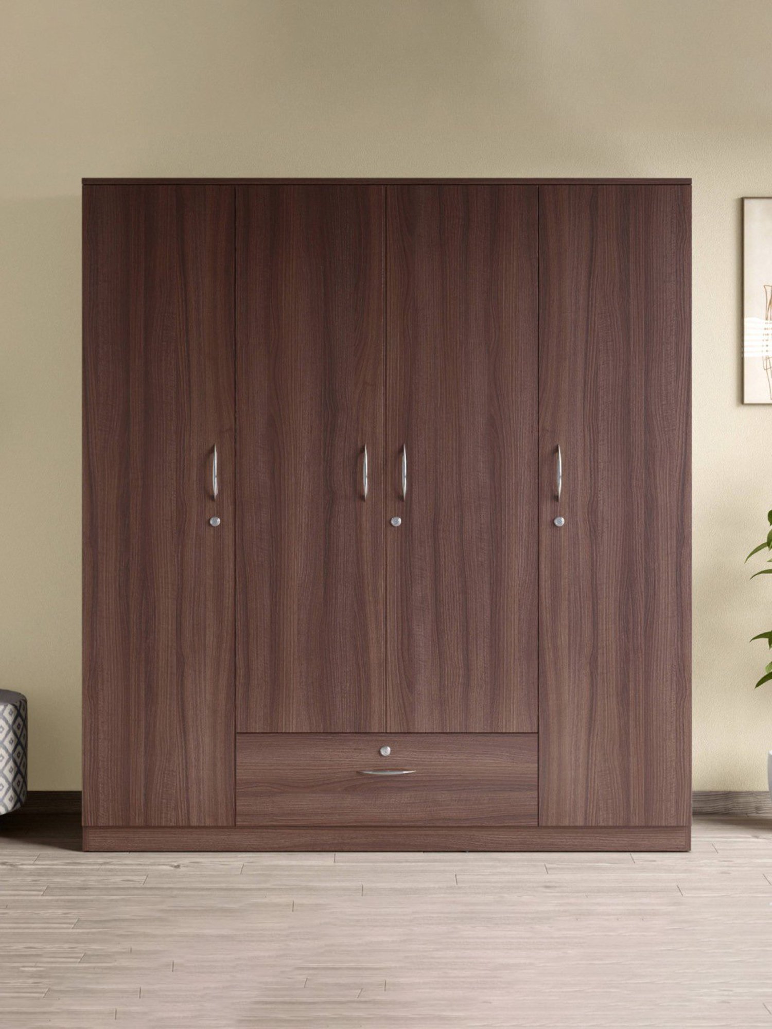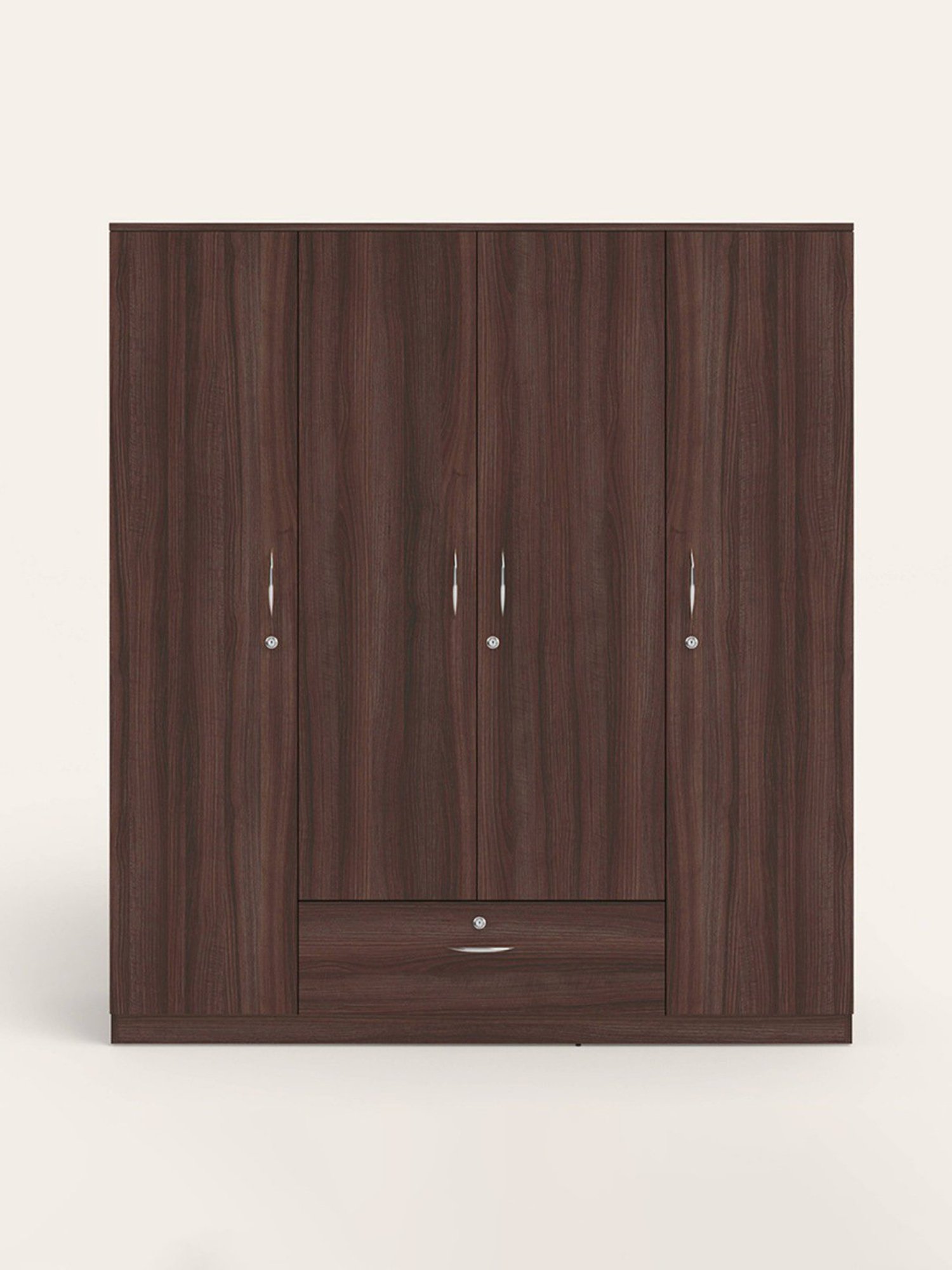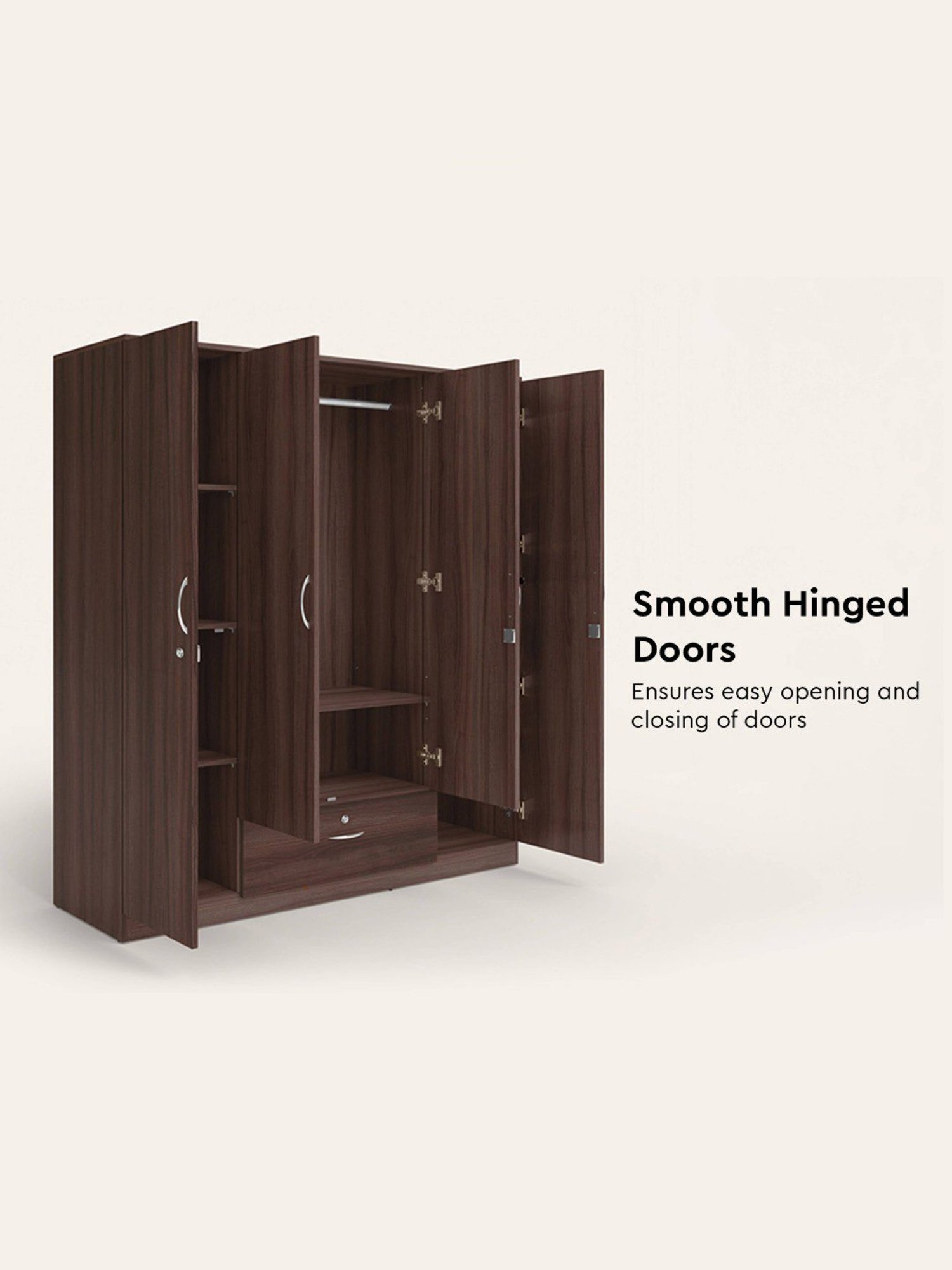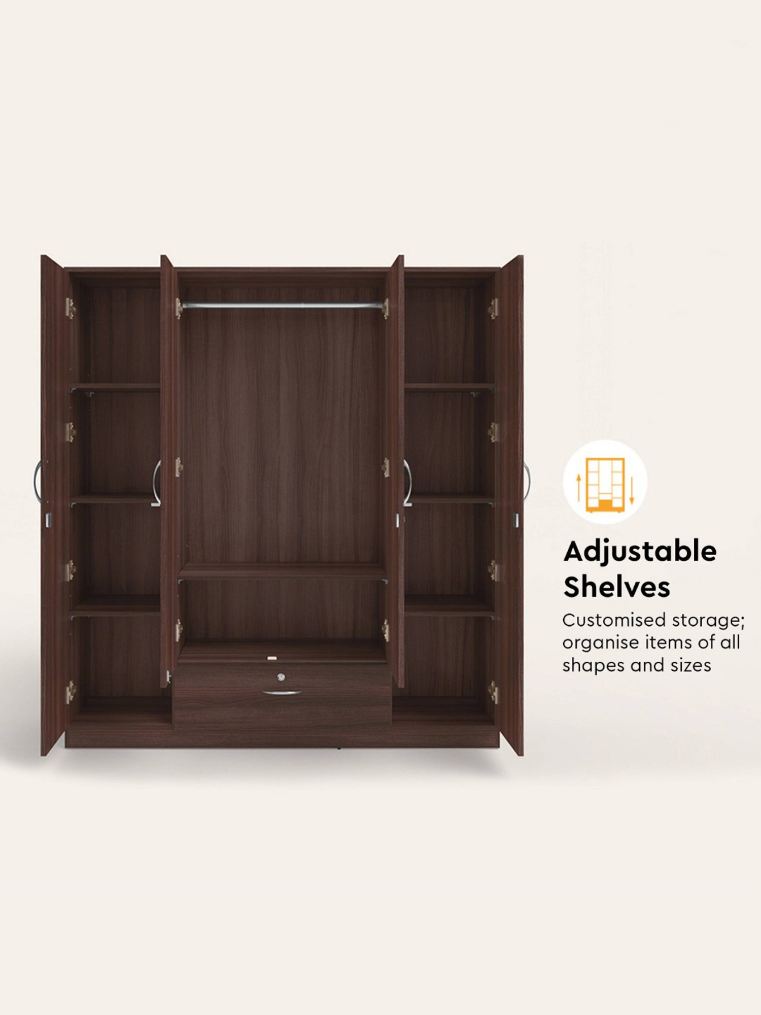This Ewa 4-Door Wardrobe with Drawer from Godrej Interio is a pinnacle of functionality and elegance for your bedroom. This engineered wood wardrobe boasts ample storage with four hinged doors for increaded stability. The non-partitioned hanging space with aluminum hanging rod offers increased hanging storage allowing you to store long dresses and coats. Additionally, thanks to the five adjustable shelves and a below lockable drawer, organizing becomes more convenient. With separate locks on two doors, single door and the bottom drawer.
