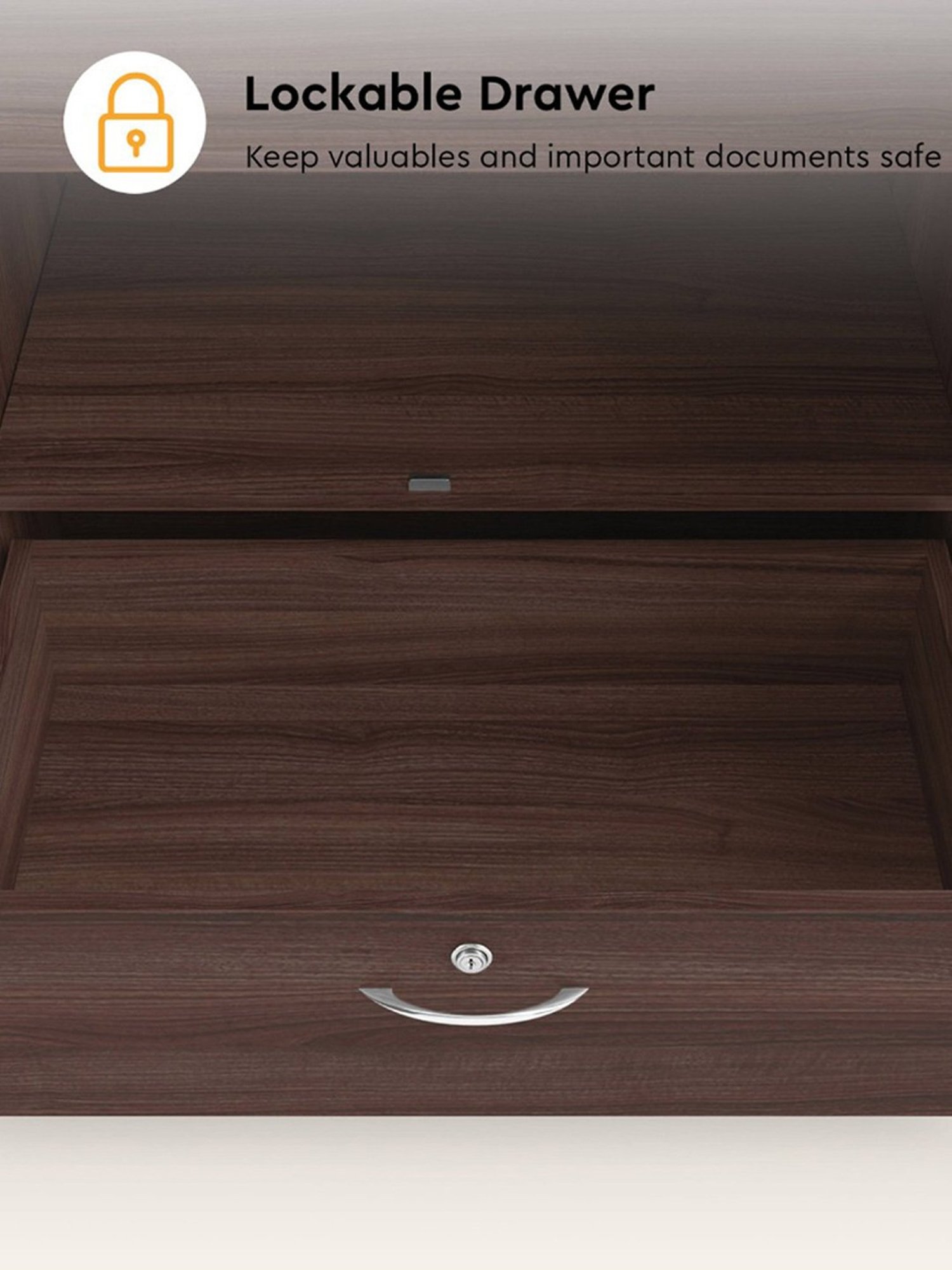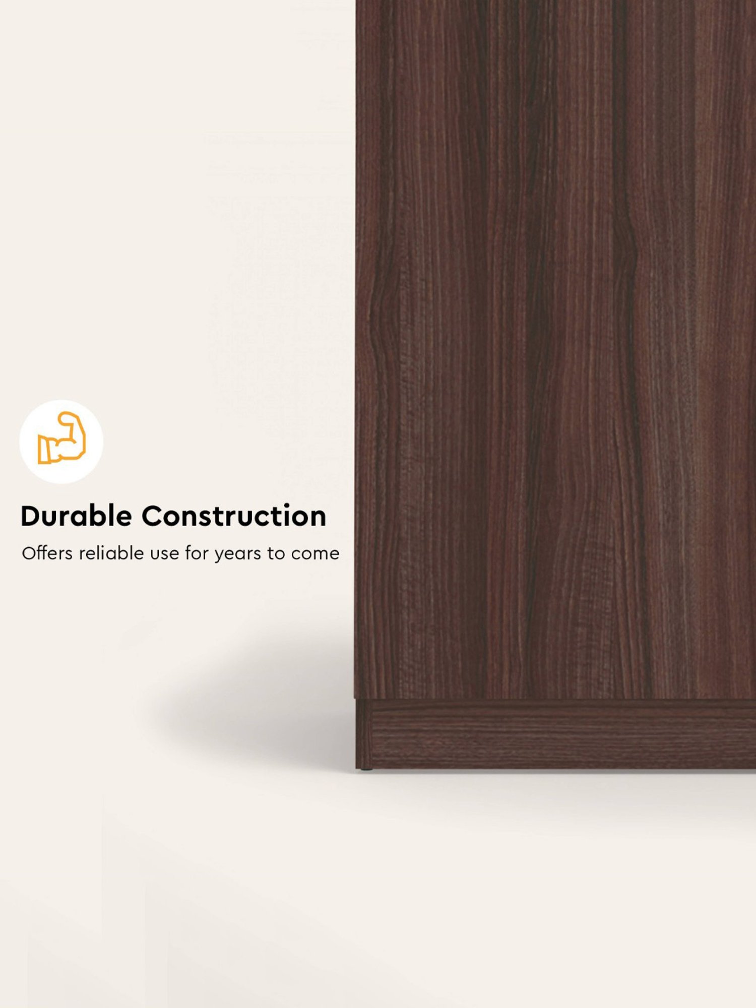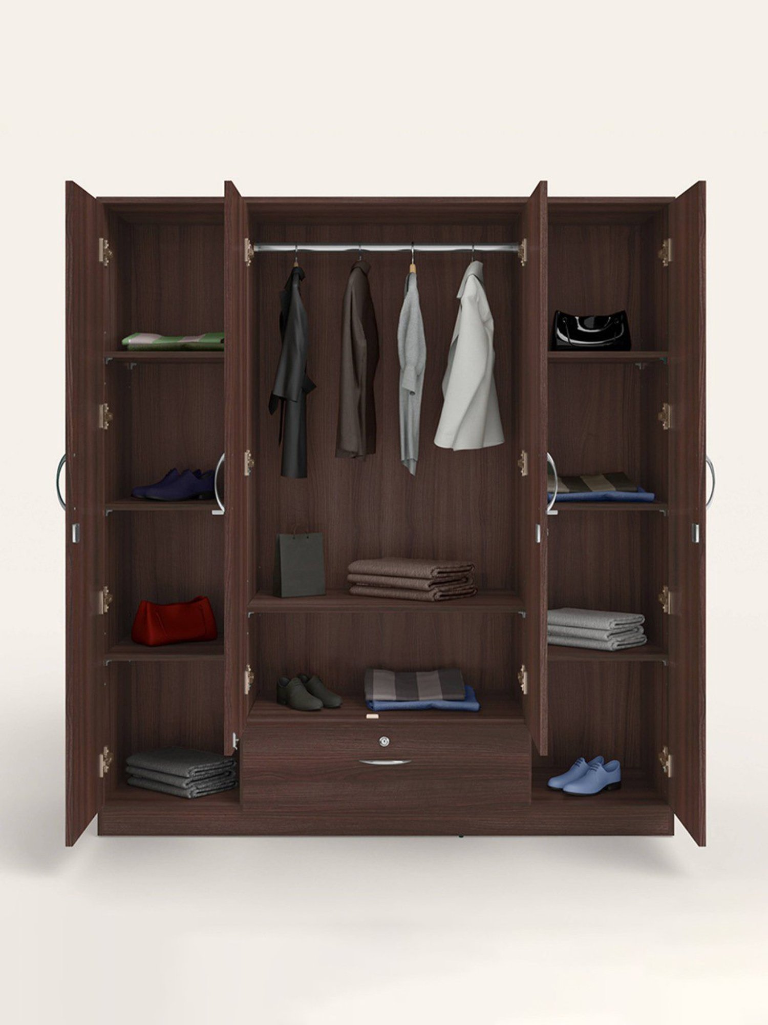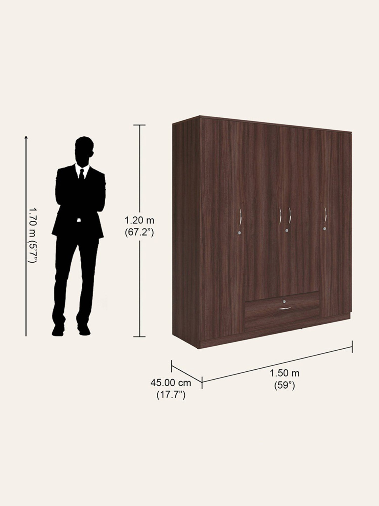 This Ewa 4-Door Wardrobe with Drawer from Godrej Interio is a pinnacle of functionality and elegance for your bedroom. This engineered wood wardrobe boasts ample storage with four hinged doors for increaded stability. The non-partitioned hanging space with aluminum hanging rod offers increased hanging storage allowing you to store long dresses and coats. Additionally, thanks to the five adjustable shelves and a below lockable drawer, organizing becomes more convenient. With separate locks on two doors, single door and the bottom drawer.