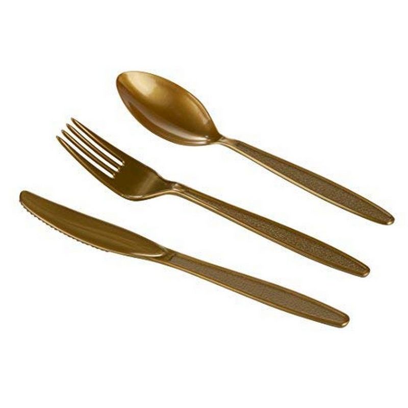 SERVES 24: Includes enough tableware for 24 guests; contains 24 of each of the following: Plastic Knives, Spoons, Forks and Paper Plates, Napkins and Cups. The plastic silverware is in antique gold while the paper plates, napkins and cups are featuring gold polka dots.