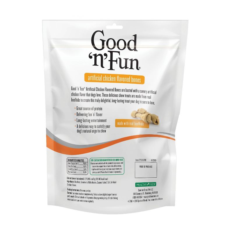 Good ‘n’ Fun® brand offers a tasty smorgasbord of flavors that dogs love. These delicious chews are made from the finest ingredients, including real beef hide and real chicken, to create truly delightful, long-lasting treats your dog will love.Entertain your dog with goodness. Tails will be wagging for flavor-packed Good ‘n’ Fun® Artificial Chicken Flavored Bones. These delicious dog chews contain real beef hide basted with added savory artificial chicken flavor for a great-tasting combination your medium-sized dog will love. Good ‘n’ Fun Artificial Chicken Flavored Bones are a delicious way to satisfy your dog’s natural urge to chew. These flavorful, twist-shaped chews are a great source of protein and make for long-lasting entertainment.Good ‘n’ Fun brand has a variety of chews for any size dog. Choose a chew slightly larger than your pet’s mouth. Discard any fragments or chunks to prevent choking. Always provide plenty of fresh drinking water, and visit your veterinarian regularly. These bones are an appropriate snack to give all medium-sized dogs.Good ‘n’ Fun products come with a money-back guarantee if you’re not satisfied with your purchase for any reason – see product packaging for details.