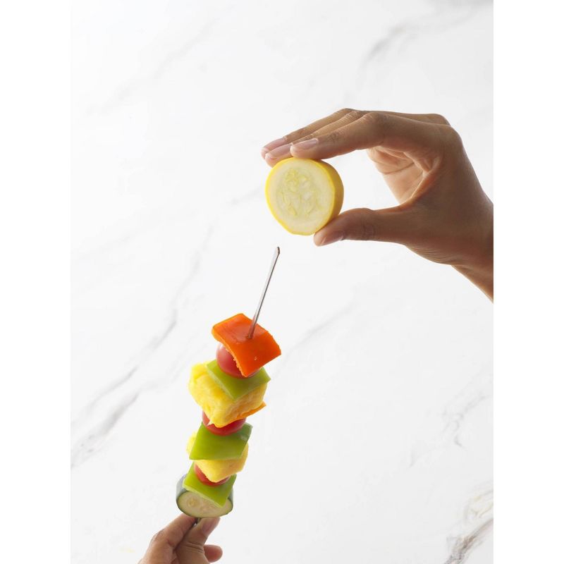 •Slide on and secure cuts of meat, seafood, vegetables or fruit for barbecuing and serving kebabs and snacks.