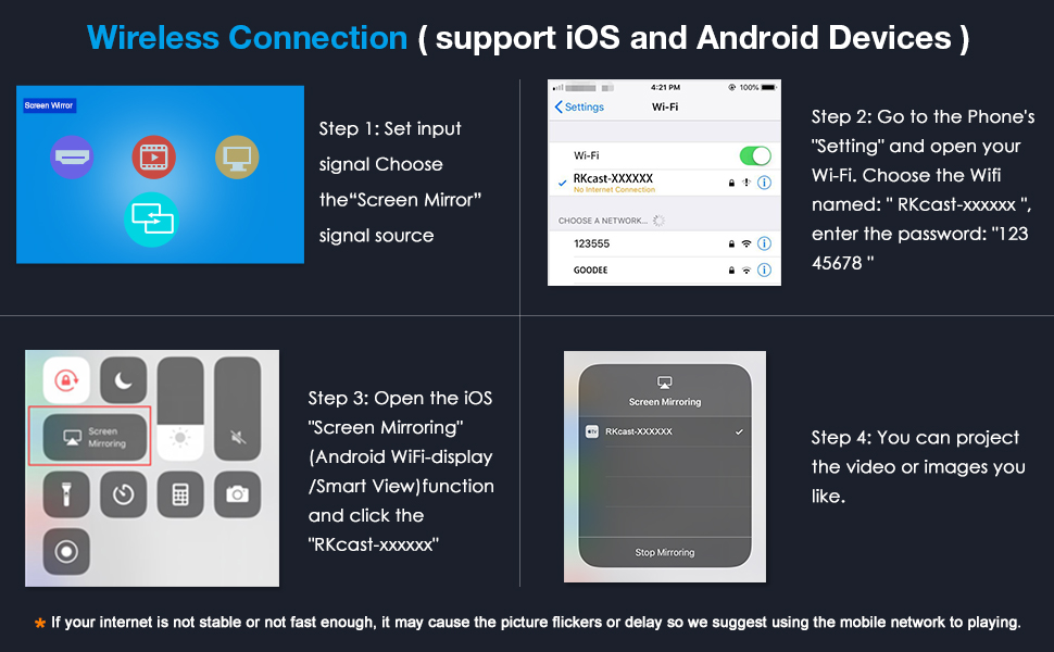 You could successfully connect the mini projector to your device via WiFi or Original USB Data Cable. Cast screen quickly, bring you the ultimate visual experience.