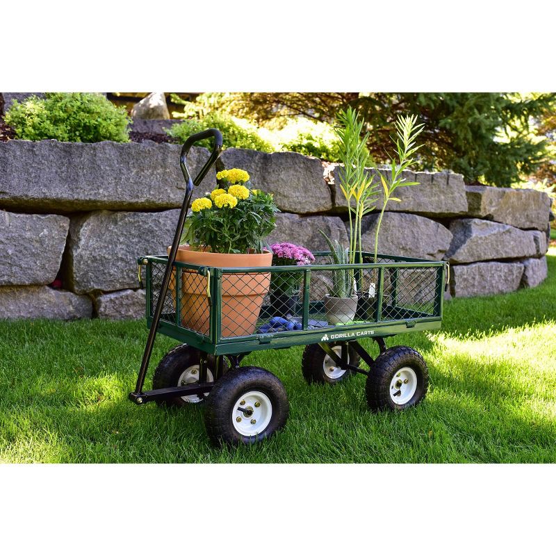 The newly-designed Gorilla Carts Steel Garden Cart has been engineered to significantly reduce assembly times, making it quick and easy to put this cart to work. The new frame design improves maneuverability, increases ground clearance, and gives the cart a tighter turn radius, making it easy to move up to 400-pounds for gardening, farming, or any other outdoor jobs. The durable steel bed features removable sides that allow the cart to convert into a flatbed for moving larger materials like 2x4s, tree branches, or fence posts. The 10-inch pneumatic turf tires are designed to tackle any terrain, and the padded grip handle has also been upgraded to make hauling heavy rocks, wood, or plants easy for anyone. Whether you're an experienced farmer, a casual gardener or an occasional do-it-yourselfer, this utility cart will ensure that your outdoor projects go off without a hitch. The bed dimensions measure 34-inches by 18-inches, and the cart has an overall height of 37-inches and weighs 36.6-pounds. Gorilla Carts full line of products meets the needs of the light-duty homeowner as well as the commercial-duty professional user by offering a wide variety of carts in many sizes and weight capacities. The Gorilla Carts GOR400 Steel Garden Cart comes with a 1-year limited warranty.
