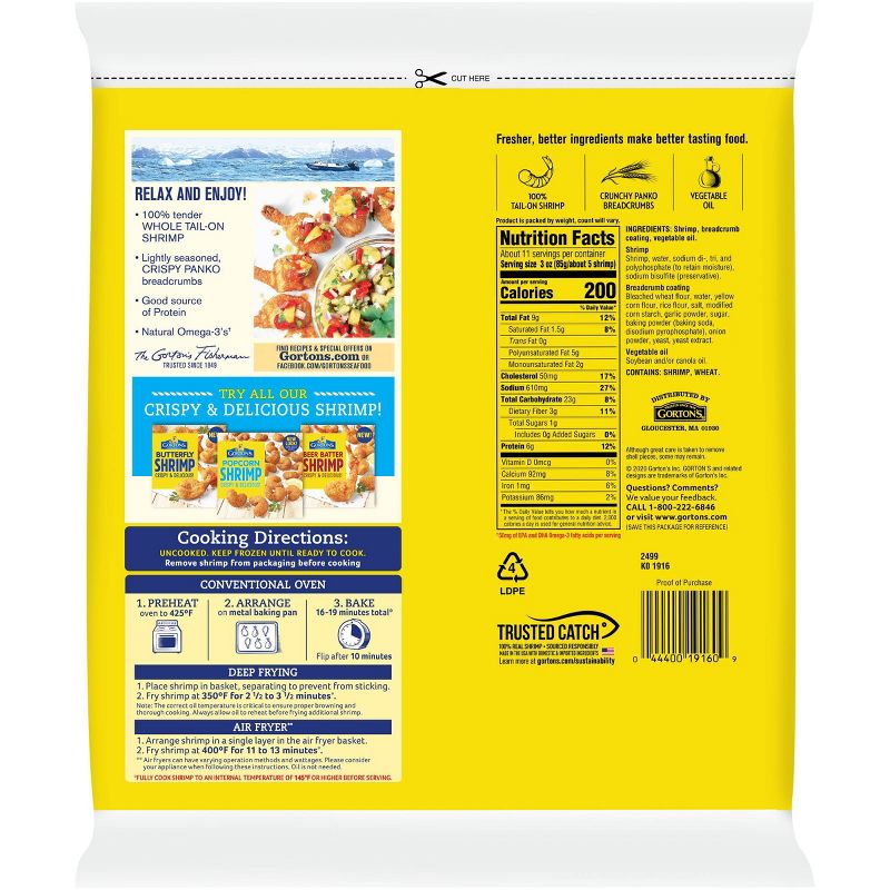 Prep-free, mess-free, stress-free. Whether it’s snack time or mealtime, with friends or with family, it’s always the right time for Gorton's Crunchy Breaded Butterfly Shrimp. The extra crunchy, buttery panko breadcrumbs makes them extra delicious, especially when paired with your favorite dipping sauce. Tender, tail-on Shrimp in buttery panko breadcrumbs. Whole, tail-on butterfly Shrimp, sourced responsibly.