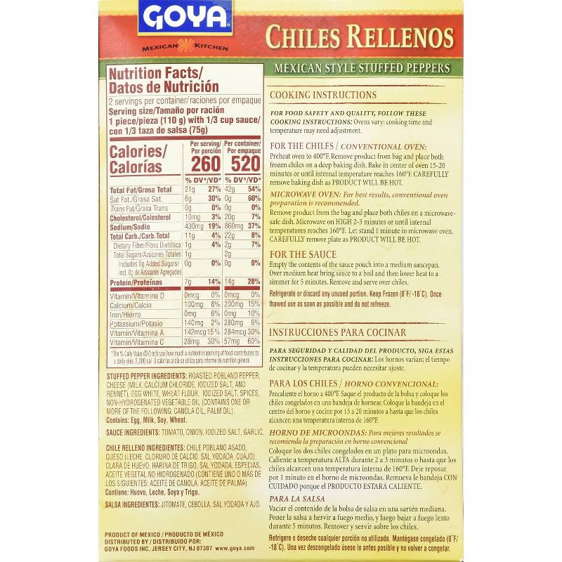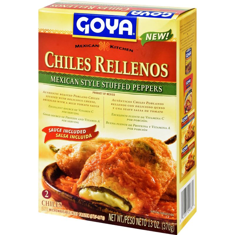 •Goya Frozen Chiles Rellenos, Authentic Roasted Poblano Chiles stuffed with delicious cheese, drizzled with a mild tomato sauce