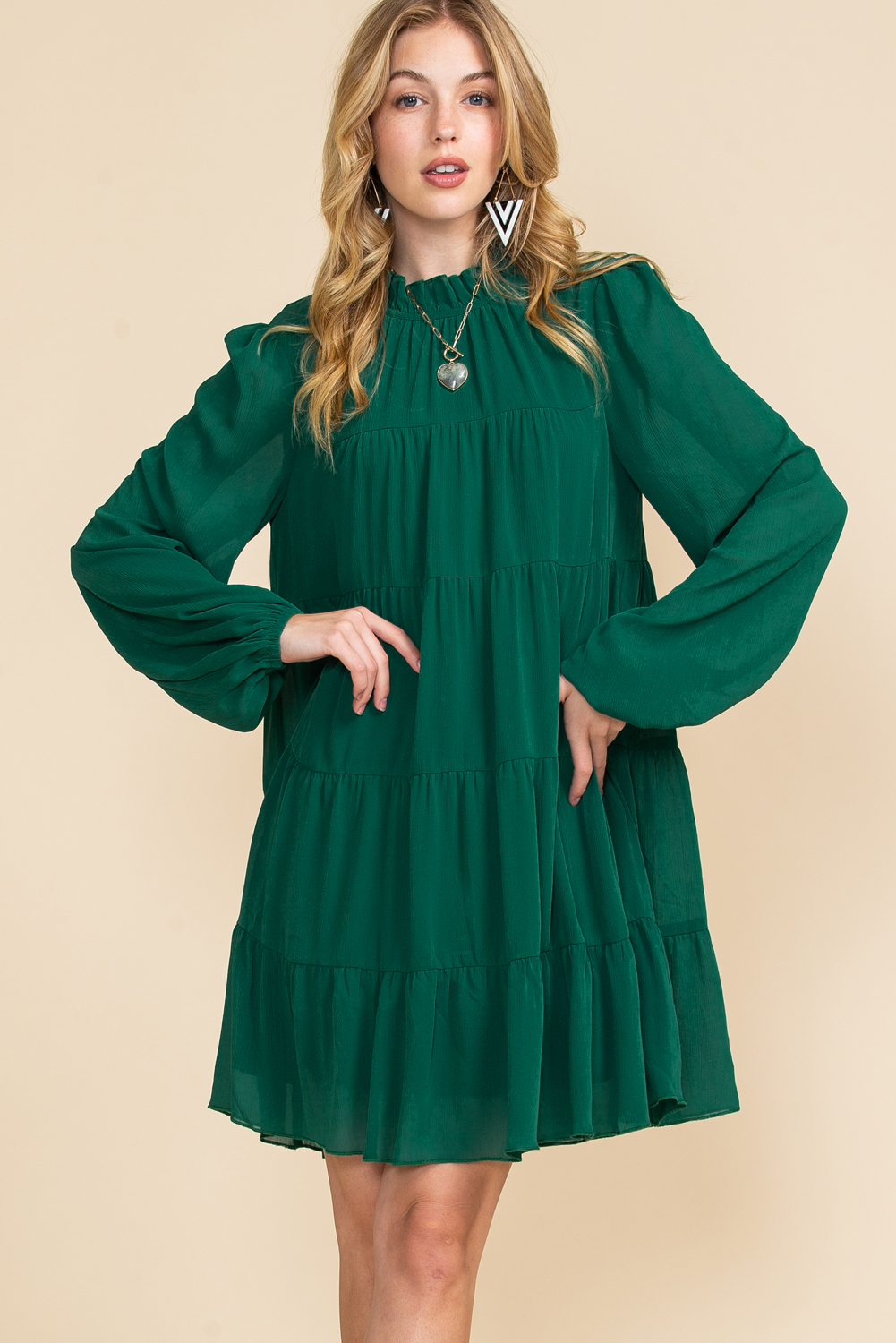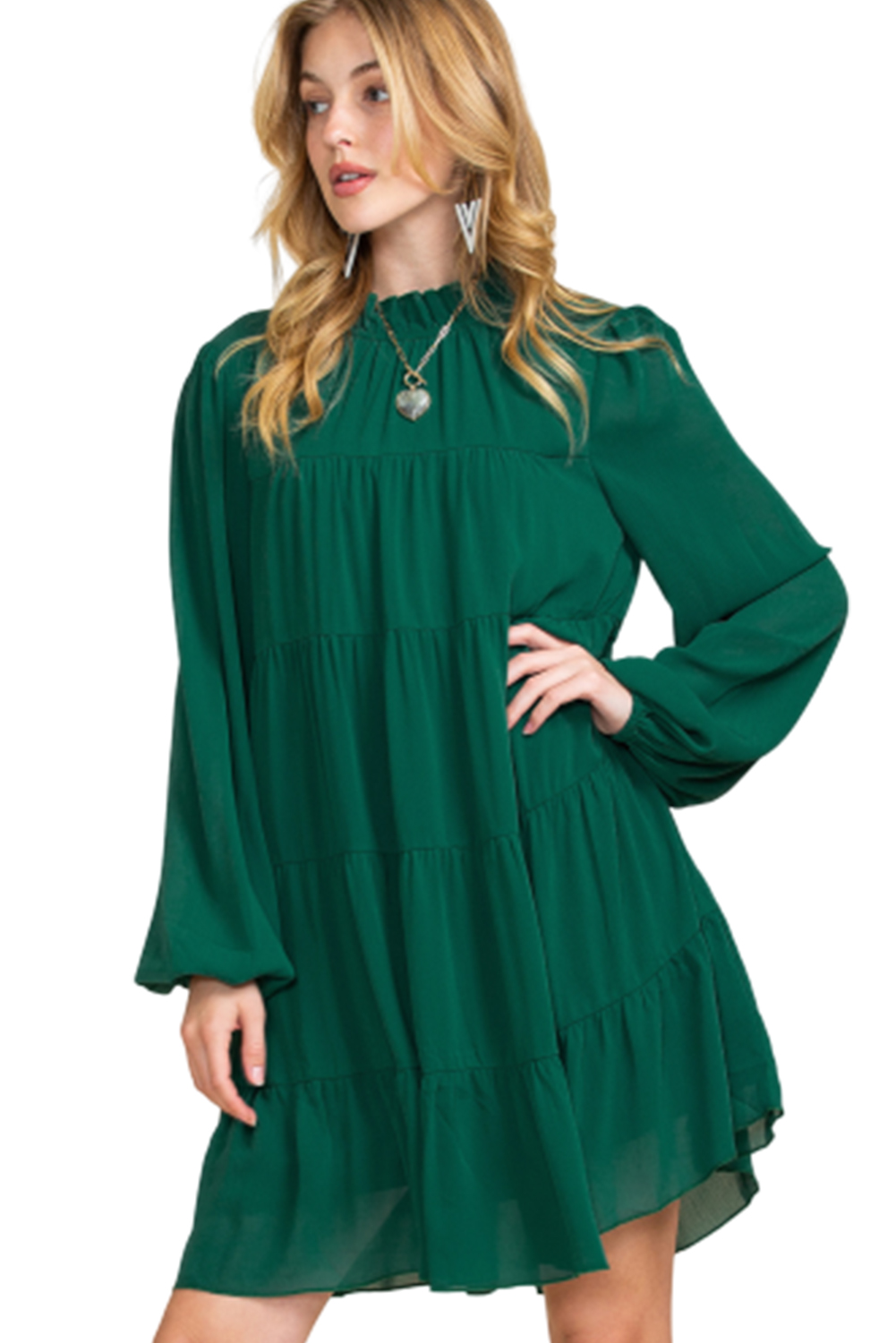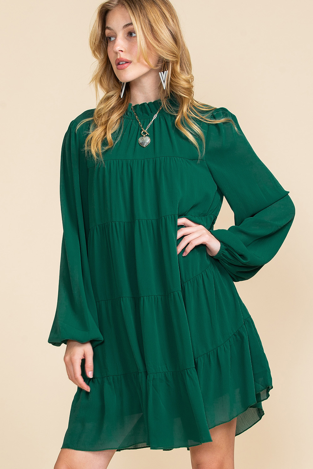 Elevate your style with our Green Mock Neck Solid Color Pleated Mini Dress, a chic and sophisticated option for any occasion.