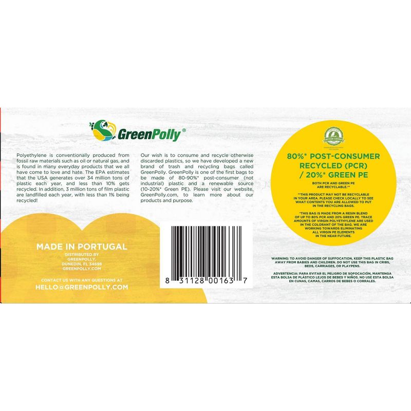 The GreenPolly brand aims to make a difference. Our wish is to consume and recycle otherwise discarded plastics by Giving Waste a New Life! Our 13 Gallon Kitchen Recycling Bags are made from 3rd party certified PCR (post-consumer recycled) content that comes from plastic films that have been used, recovered, and recycled into new products that can be used again. These durable bags are compatible with municipal Clear Bag recycling programs where applicable. The clear, unscented design allows you to see the contents of the bag and is compatible with most tall kitchen bins. Clean the planet. Please the planet. Use a recycled option like GreenPolly Recycling Bags.