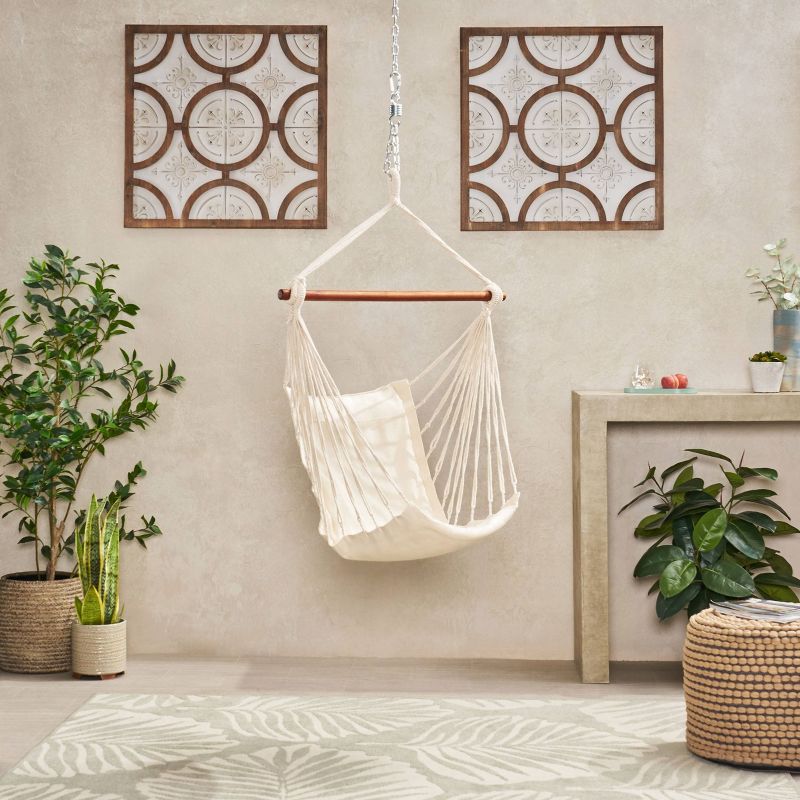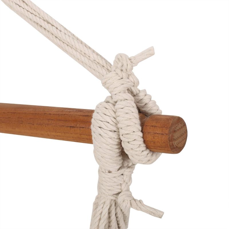 ROPE WEAVE: The hammock chair is gracefully attached to its hanging bar using intricately woven ropes. Not only does this provide an exquisite knotted look but it also provides assuring durability and support.