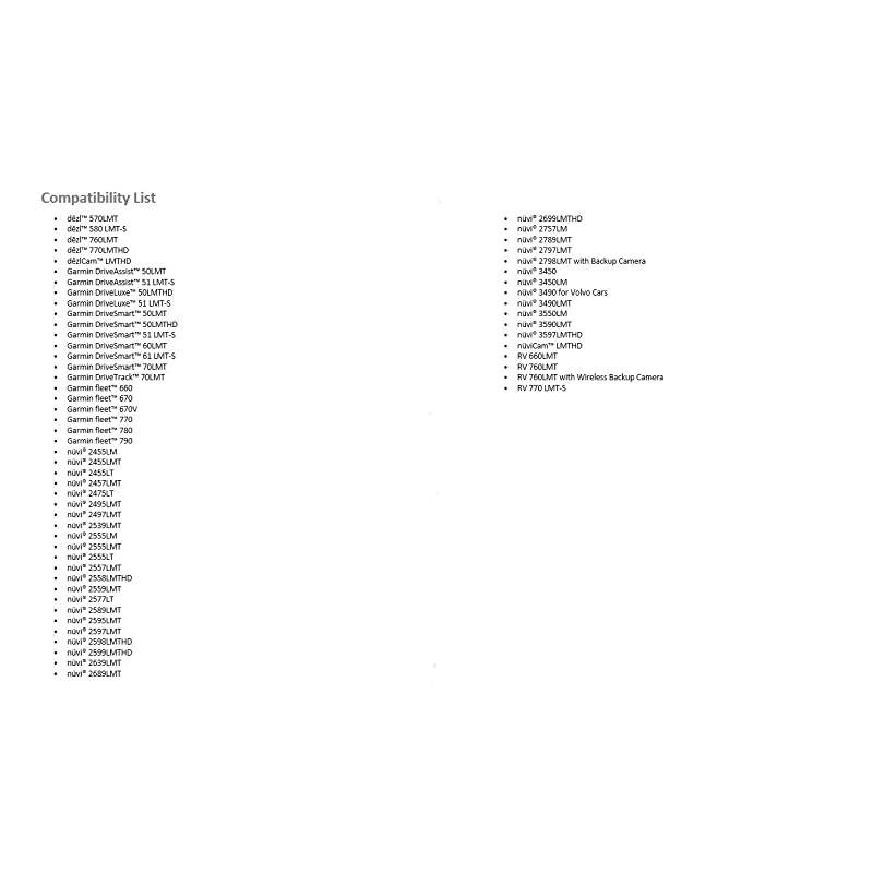 Compatibility List: dzlCam LMTHD, North America - 010-01457-00dzl 570LMT, North America - 010-01342-00dzl 760LMT, Europe - 010-01062-10dzl 760LMT, North America - 010-01062-02dzl 770LMTHD, North America - 010-01343-00 DriveAssist 50 LMT, North America - 010-01541-01 DriveLuxe 50 LMTHD, North America - 010-01531-00 DriveSmart 50LMT, North America - 010-01539-01 DriveSmart 50 LMTHD, North America - 010-01539-00 DriveSmart 60LMT, North America - 010-01540-01 DriveSmart 70LMT, North America - 010-01538-01 DriveTrack 70LMT, North America - 010-01696-00nüviCam LMTHD, North America - 010-01378-01nüvi 2455LM - 010-01001-28nüvi 2455LMT, North America - 010-01001-29nüvi 2457LMT, North America - 010-01124-24nüvi 2495LMT, North America - 010-01001-01nüvi 2497LMT, North America - 010-01124-30nüvi 2539LMT, North America - 010-01187-02nüvi 2555LM - 010-01002-31nüvi 2555LMT - 010-01002-29nüvi 2557LMT, North America - 010-01123-23nüvi 2559LMT, North America and Europe - 010-01187-05nüvi 2577LT, North America and Europe - 010-01123-29nüvi 2589LMT, North America - 010-01187-01nüvi 2595LMT, North America - 010-01002-01