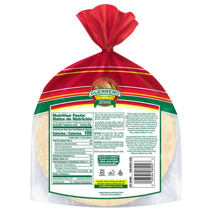 We use high quality ingredients and time-tested techniques to make sure every package of Guerrero White Corn Tortillas are an authentic addition to your family's dinner table. Our tortillas have a soft texture and traditional flavor that enhances any recipe, from Mexican dishes passed down through the generations to any modern twist you can come up with. Guerrero White Corn Tortillas are also gluten free and don't contain any lard, trans fat, or cholesterol. We recommend loading our corn tortillas with homemade carne guisada topped with avocado and cotija cheese. Includes one 30ct package of Guerrero White Corn Tortillas.