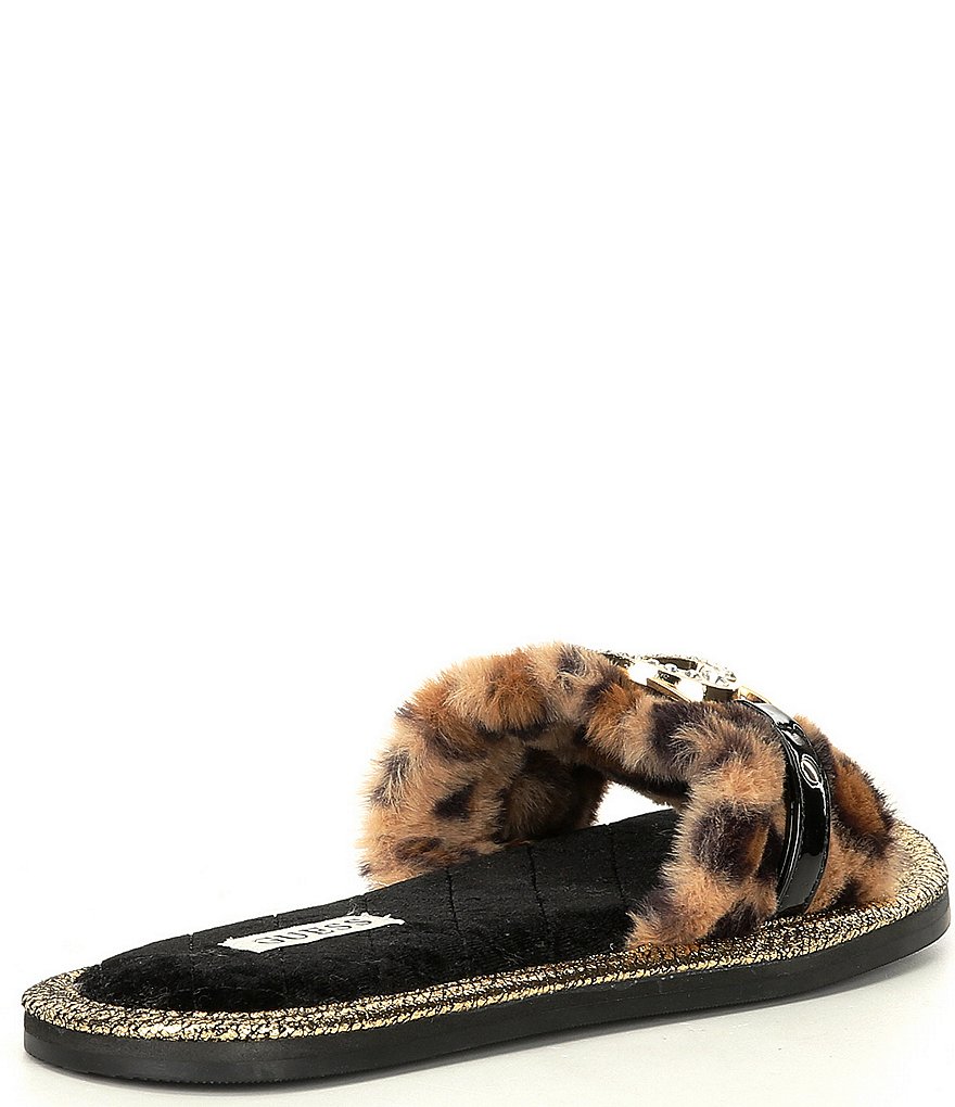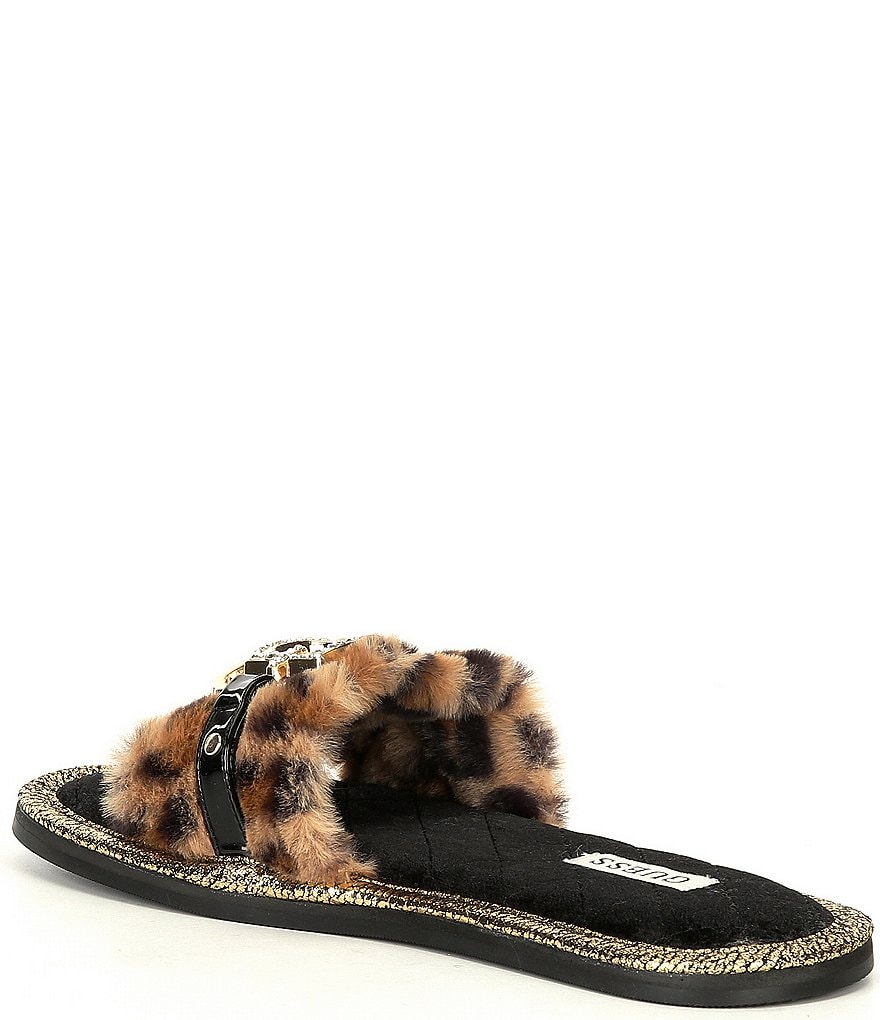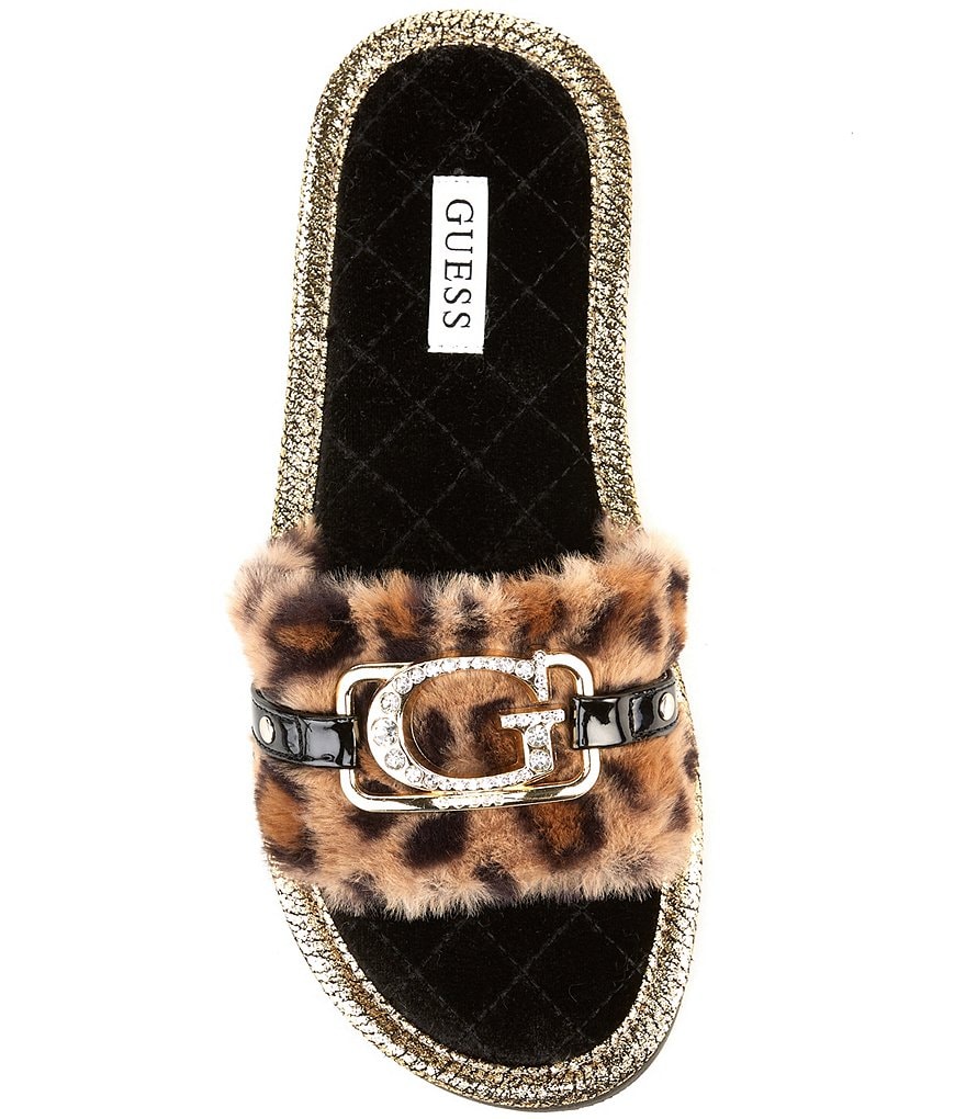 From Guess, the Sannah Leopard Print Faux Fur Slides feature: