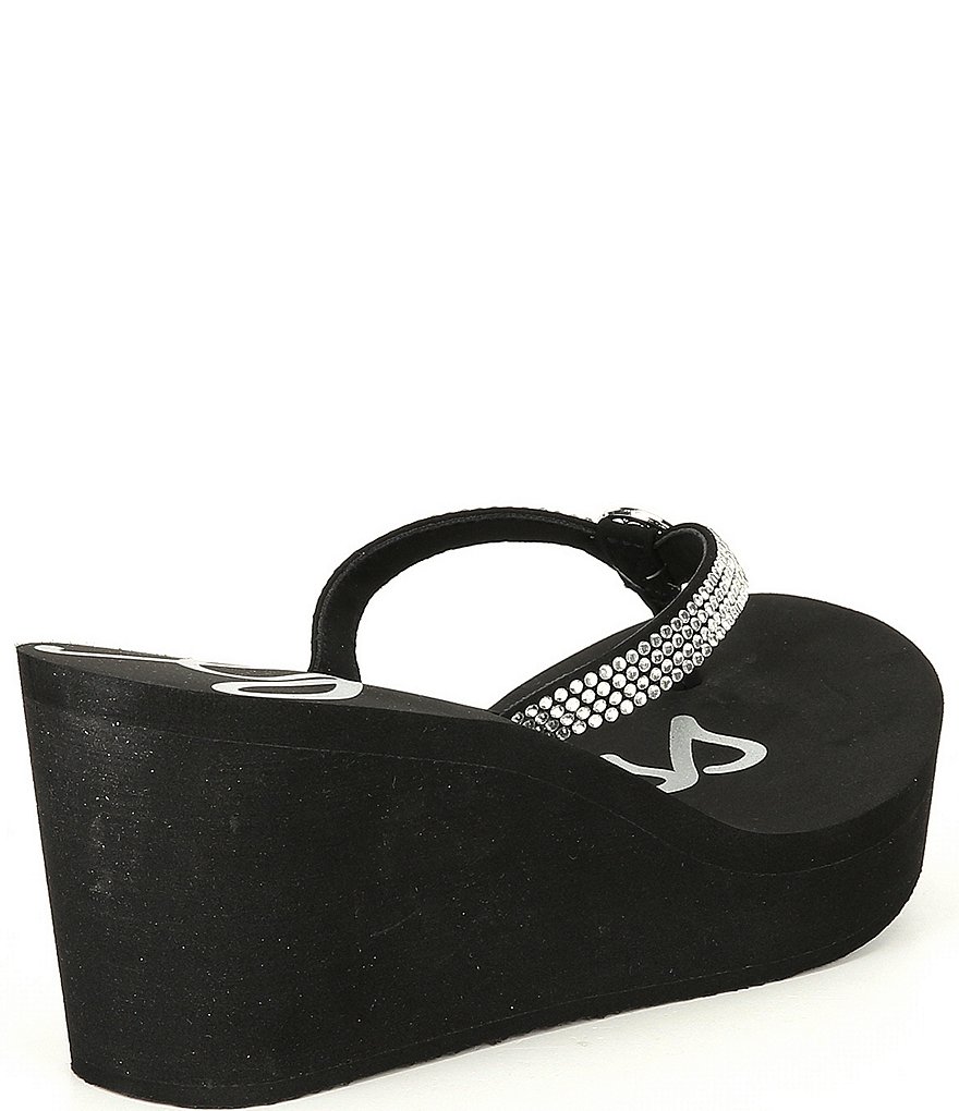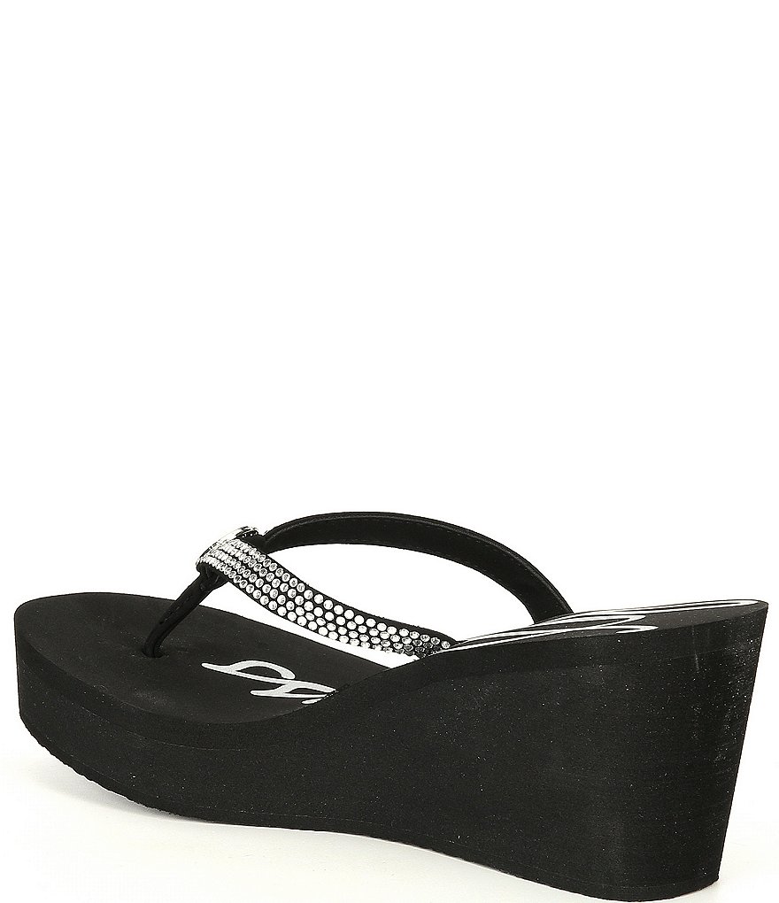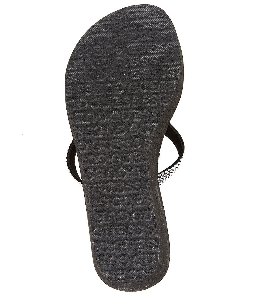 From Guess, the Sechi Rhinestone Thong Wedges feature: